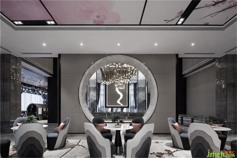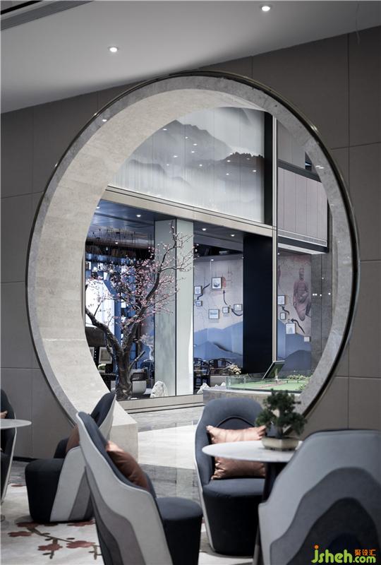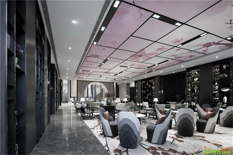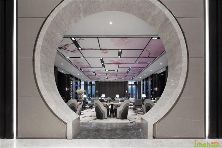 正廳為洽談區(qū),主題上強(qiáng)調(diào)的是“聚”,通過(guò)舒適而極具觀賞性的洽談桌椅陳設(shè)以及天花頂部科技屏所營(yíng)造的動(dòng)態(tài)桃花畫(huà)面,讓匯聚于此的天下賓朋猶如置身桃花源中,一邊感受桃花源般的雅致意境,一邊體驗(yàn)輕松愉悅的洽談氛圍。