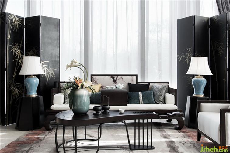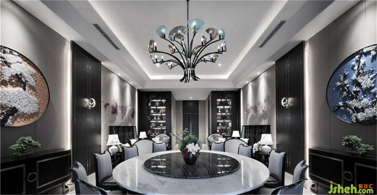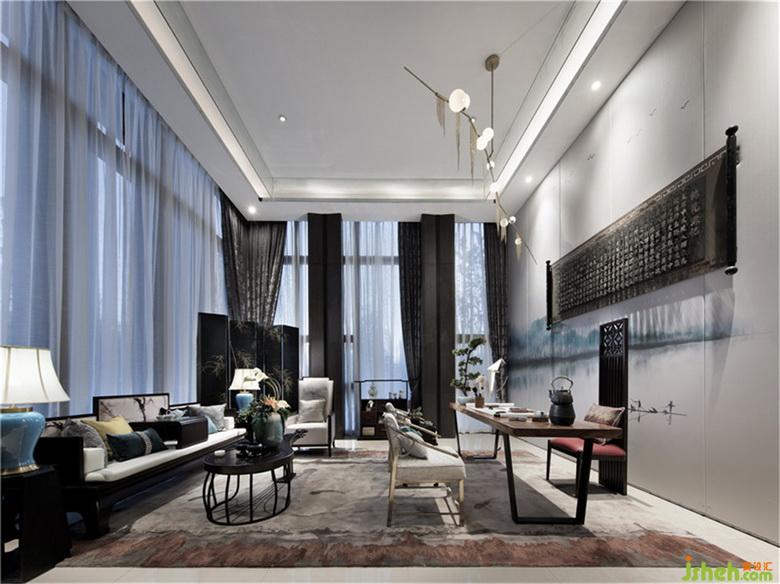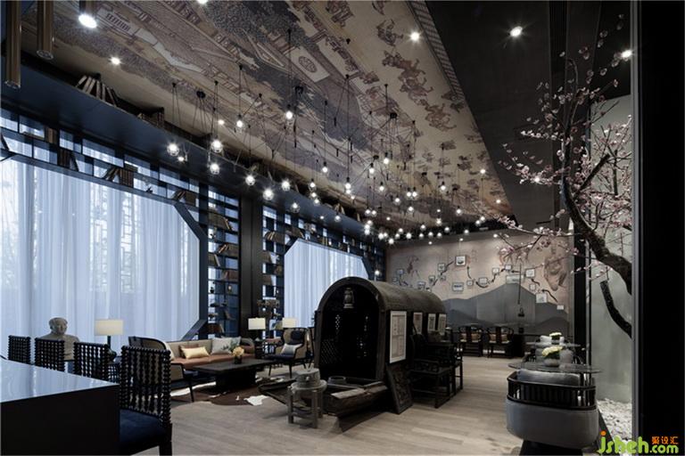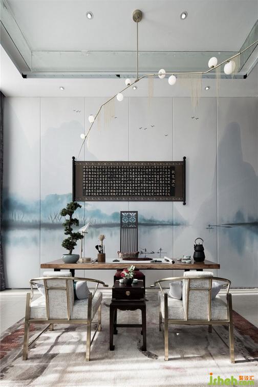 以古時(shí)琵琶造型作為茶幾、地下的地毯如川流不息的小河,河中魚兒在美妙的琴聲中游動(dòng),軟裝陳設(shè)在此與硬裝山水景完美地融為一體,使空間富有靈氣、栩栩如生。