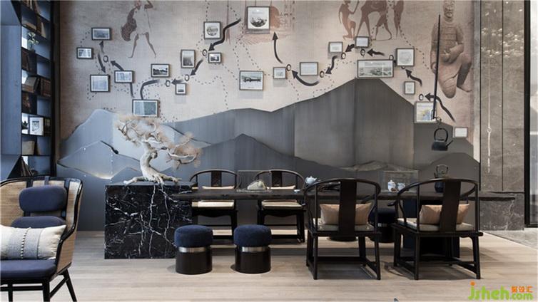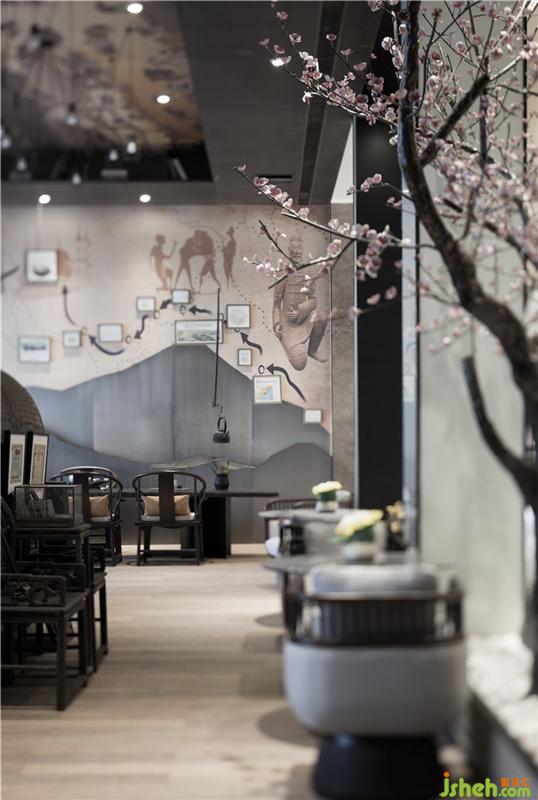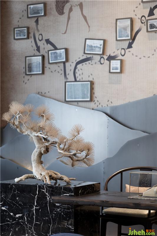 品茶區(qū)墻面采用各個(gè)時(shí)期常德城市照片,體現(xiàn)當(dāng)?shù)貧v史發(fā)展脈絡(luò),局部則通過根雕藝術(shù)、茶具組合的進(jìn)行點(diǎn)綴,凸顯空間文化內(nèi)涵及雅致氛圍。