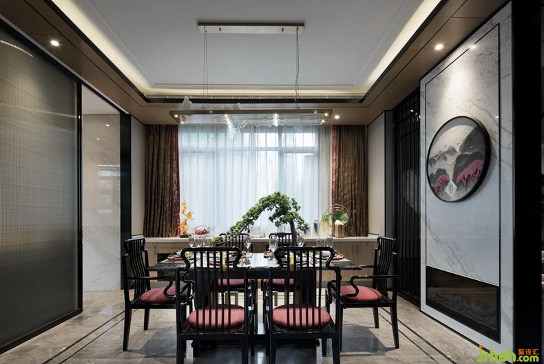 餐廳空間擺設(shè)簡(jiǎn)潔的方形大理石餐桌和黑色木質(zhì)座椅,簡(jiǎn)練的線條配以紅色坐墊,延續(xù)現(xiàn)代中式意蘊(yùn)。