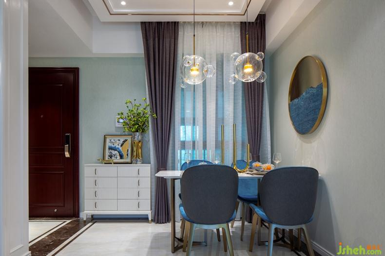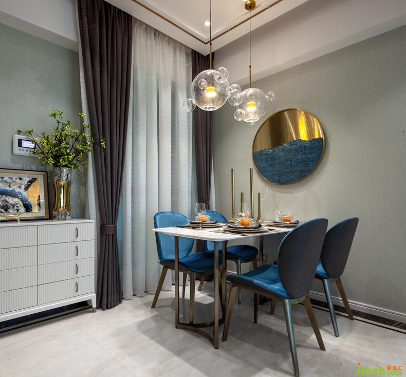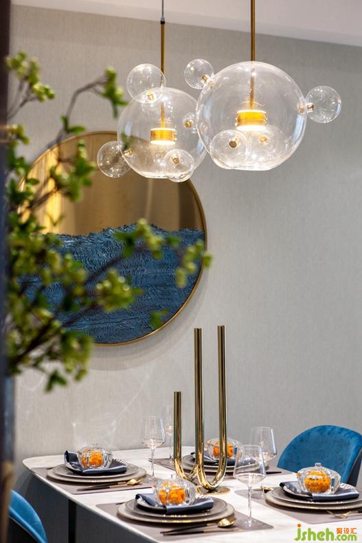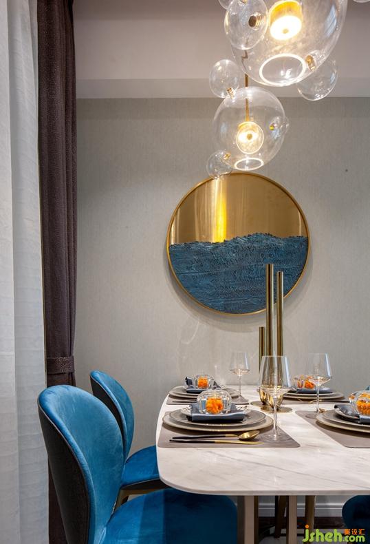 軟裝上圓形透明藝術(shù)吊燈懸掛餐桌之上與背景墻面一幅簡約金屬與海軍藍(lán)的圓形裝飾畫元素呼應(yīng),金屬的質(zhì)感,玻璃的靈動性,是整個空間的藝術(shù)氣息躍然眼前,演繹時尚和藝術(shù)的結(jié)合,呈現(xiàn)輕奢品質(zhì)生活。