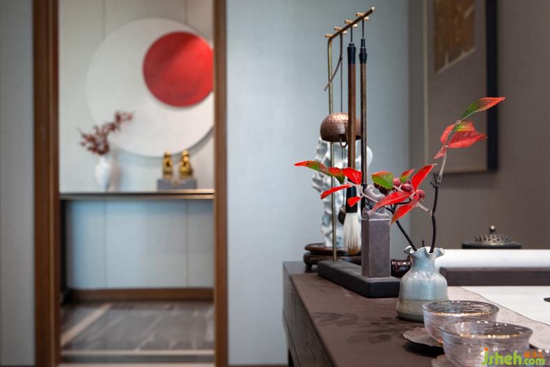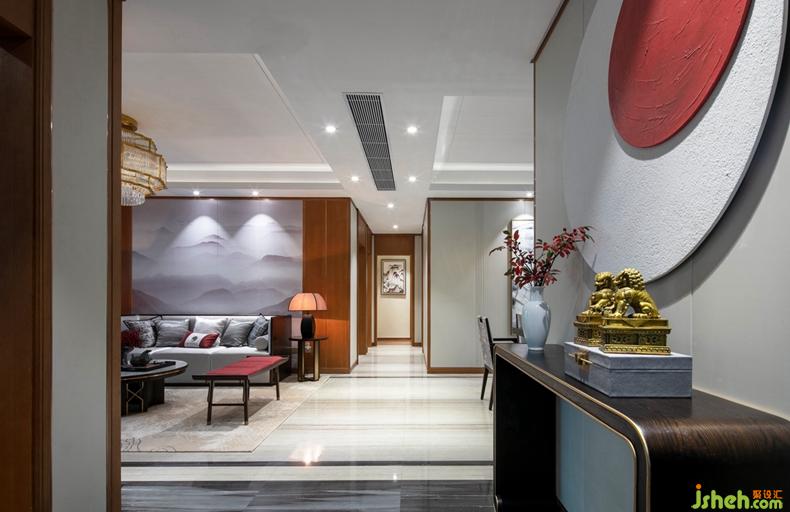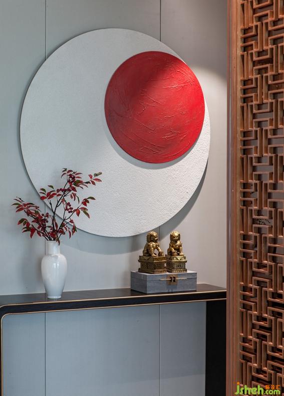 玄關(guān)設(shè)計(jì)搭配紅日、紅葉、花格屏風(fēng)等中式元素,彰顯莊重典雅的氣質(zhì),營造出蘊(yùn)含東方文化的意境空間。