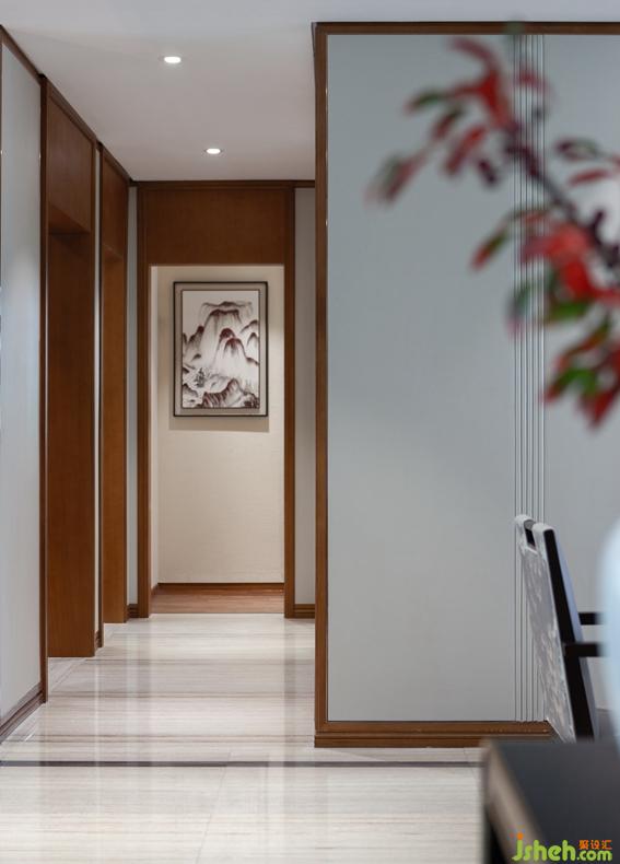 目光移向前方,走廊盡頭的墻面上裝飾著一幅中式山水畫,寓意“開門見山”,同時(shí)呼應(yīng)主題風(fēng)格。