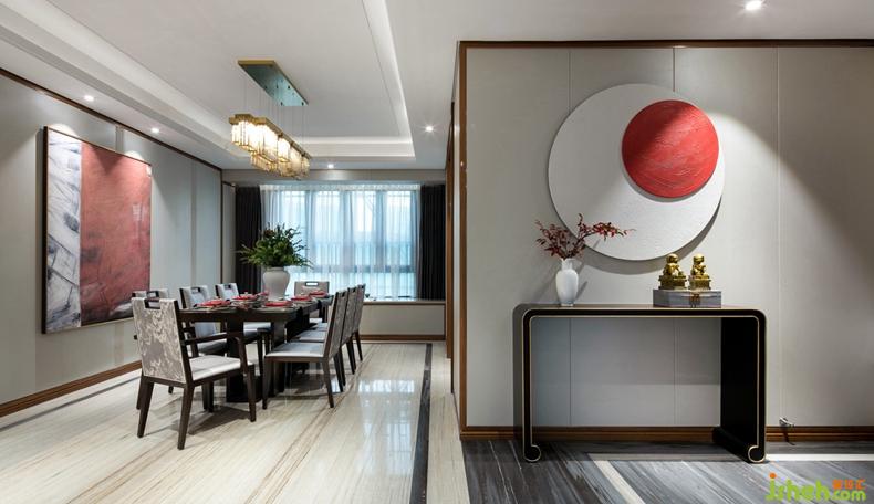 移步餐廳,墻面搭配大面積的白色皮革硬包,簡練大方,在燈光的渲染下營造出豐富的光影效果,使空間更具美感。
