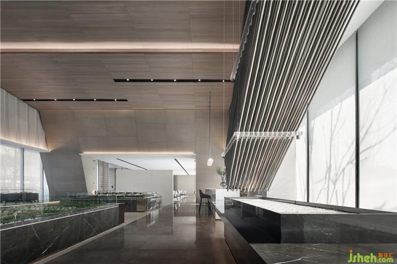 沙盤區(qū)上空,是空間幾何與建筑結(jié)構(gòu)的衍生“屋檐”,是自然與藝術(shù)的交織,傳統(tǒng)與現(xiàn)代共生,俯仰之間為造訪者提供了藝術(shù)互動(dòng)的體驗(yàn)。沙盤區(qū)空間尺度開放有力,溫潤(rùn)流暢的線條在空間里律動(dòng)和穿透