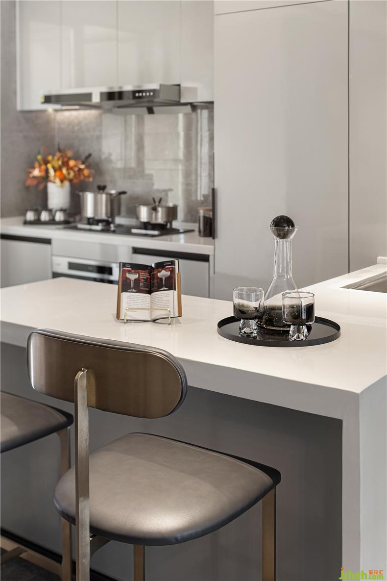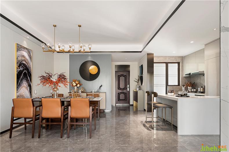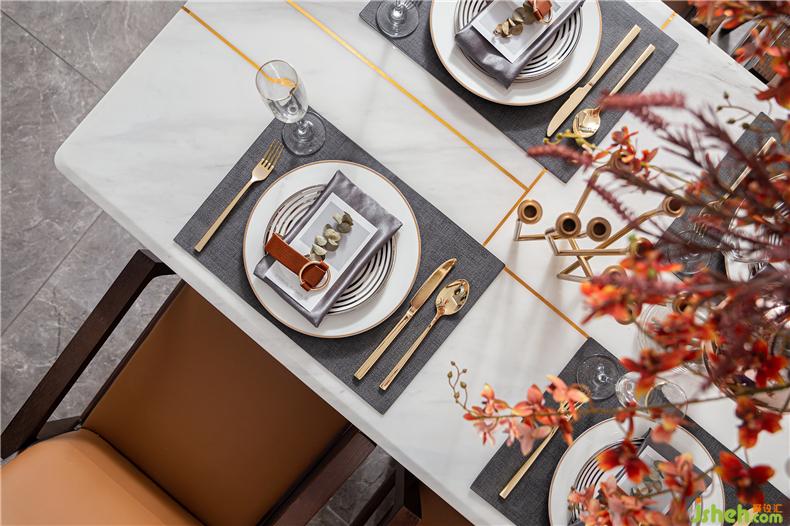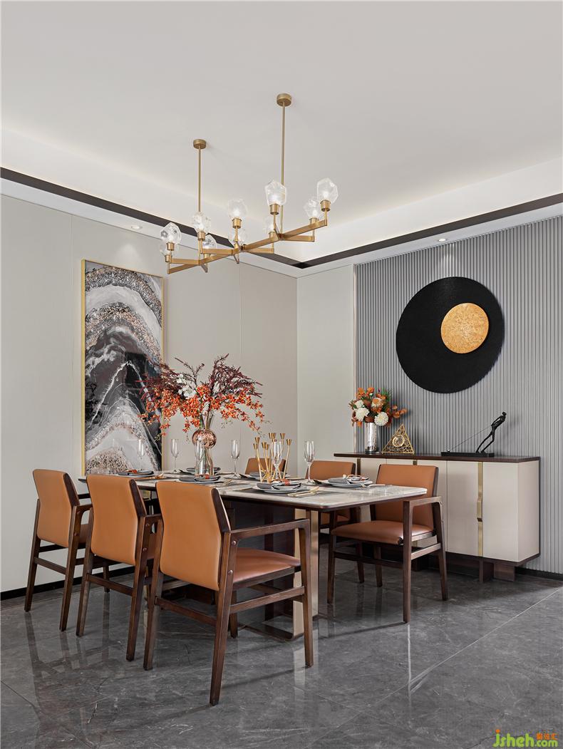 天然大理石臺(tái)面搭配具有裝飾線條感及簡約、節(jié)省空間的桌腳設(shè)計(jì),樣板房設(shè)計(jì)有助于于餐椅的擺放使用方便性