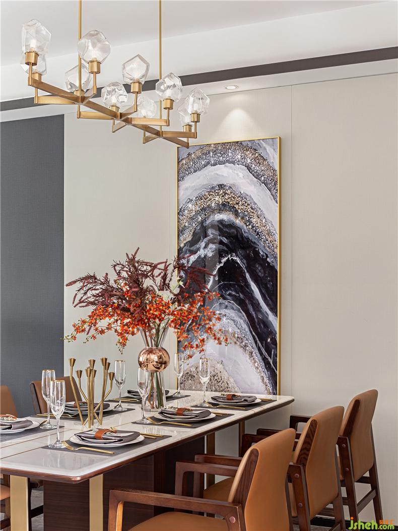開闊明餐廳,軟裝設(shè)計(jì)強(qiáng)調(diào)審美在外質(zhì)感在內(nèi),與客廳同源的背景裝飾畫為空間注入輕盈靈動(dòng)氣質(zhì)。充滿設(shè)計(jì)感的餐桌、餐椅傳遞優(yōu)雅儀式感,醞釀出現(xiàn)代詩意。