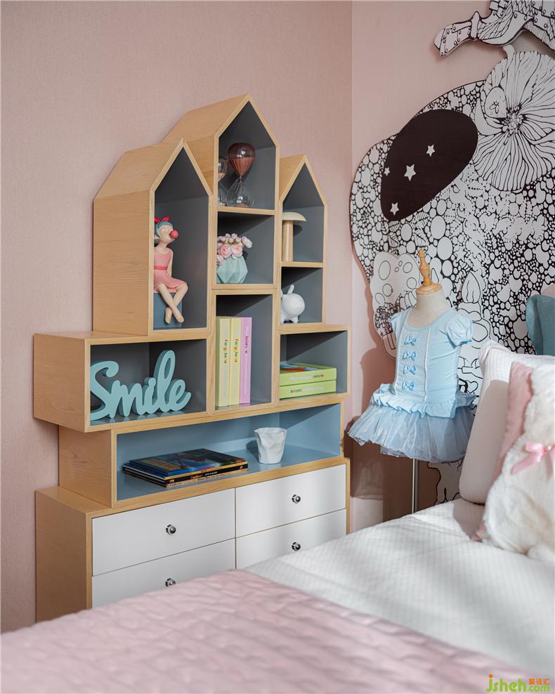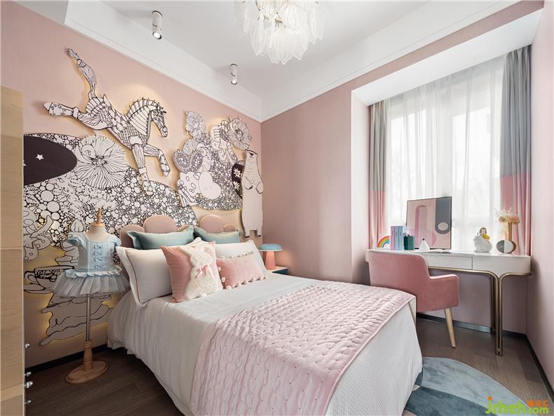 女兒房意在貼合少女純真浪漫情懷,背景墻的藝術(shù)童話剪紙讓空間既飽含童趣,同時又不至于太過幼稚,能俘獲少女心,也能適宜日漸成熟的品味