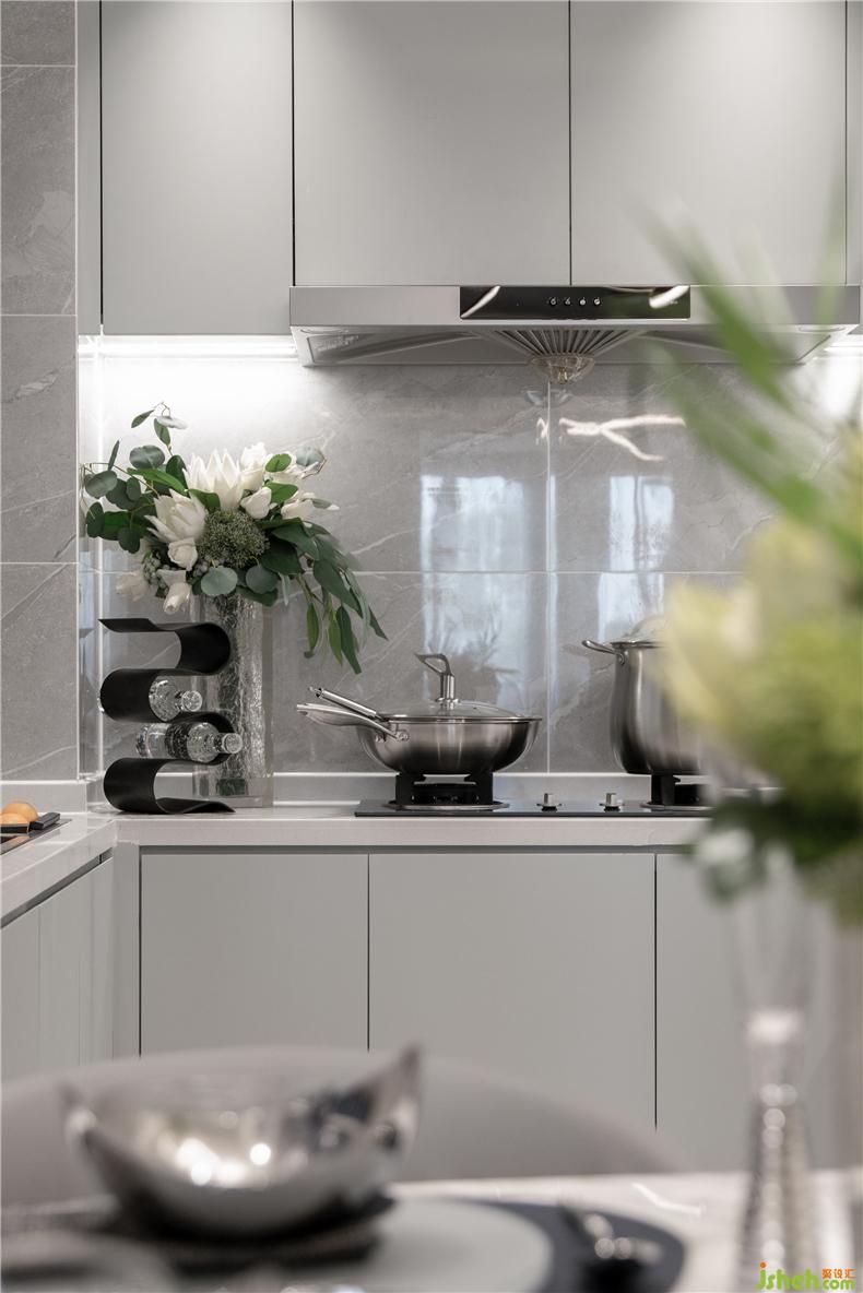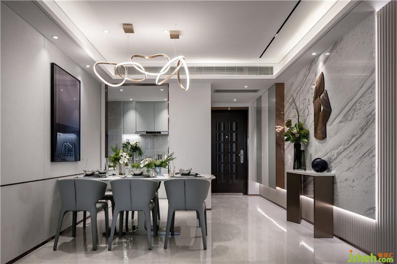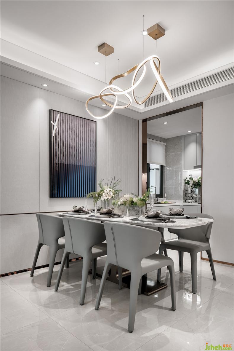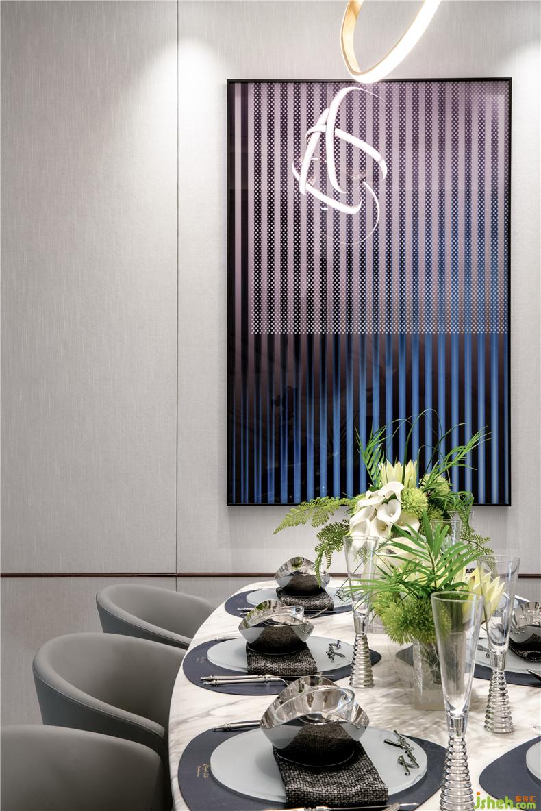 簡單、樸實、明凈是餐廳空間的代名詞,晶瑩剔透的餐具擺件映入眼簾,樣板房設計深色與淺色穿插的搭配既與空間氛圍照相輝映又與極光般的藝術(shù)燈具遙相呼應,從而達到承上啟下的渲染作用。