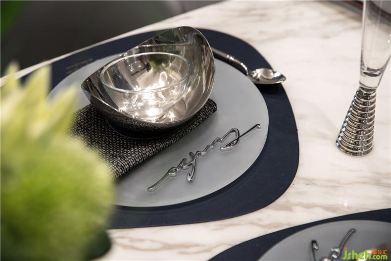 大理石餐桌搭配銀質(zhì)餐具與灰色調(diào)的餐墊,利落而前衛(wèi)。樣板房設計點綴在桌上的花藝,向陽生長,順著光的明亮,灑向桌面,將斑駁的花影星星點點揮落在桌上