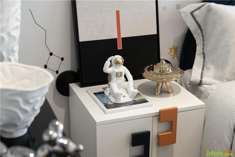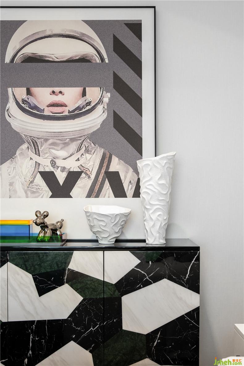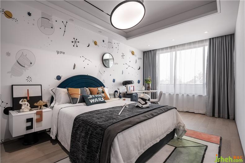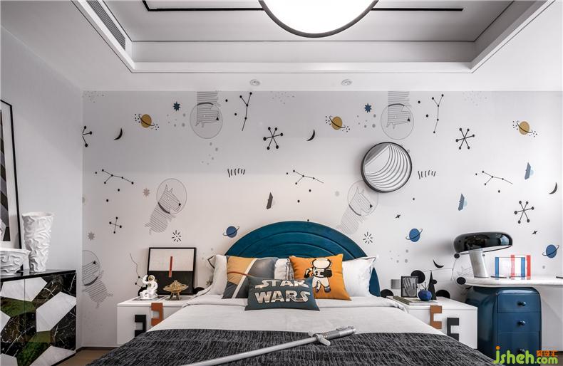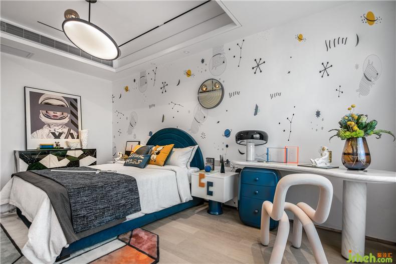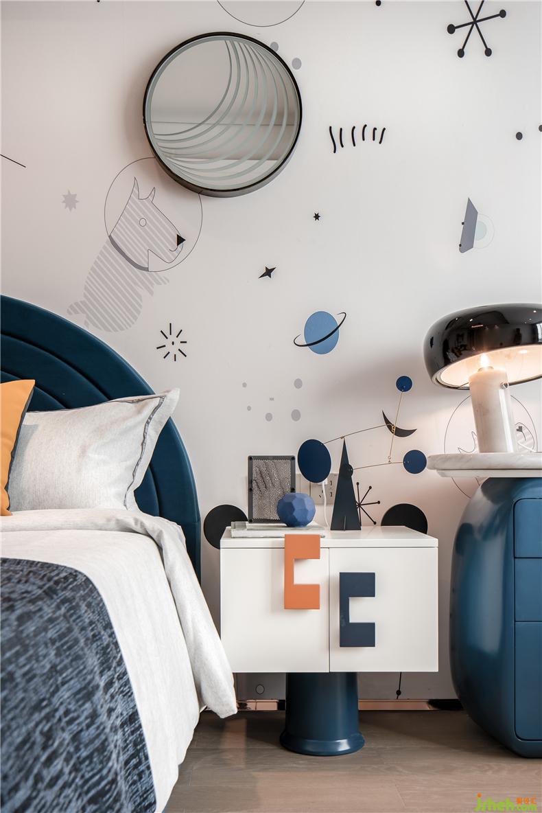 空間運用低調(diào)的煙灰藍(lán)打造別致溫馨的居住氛圍,帶著十分簡約科技圖案的墻紙與時尚飾品使簡約讓空間布局多了些許立體感