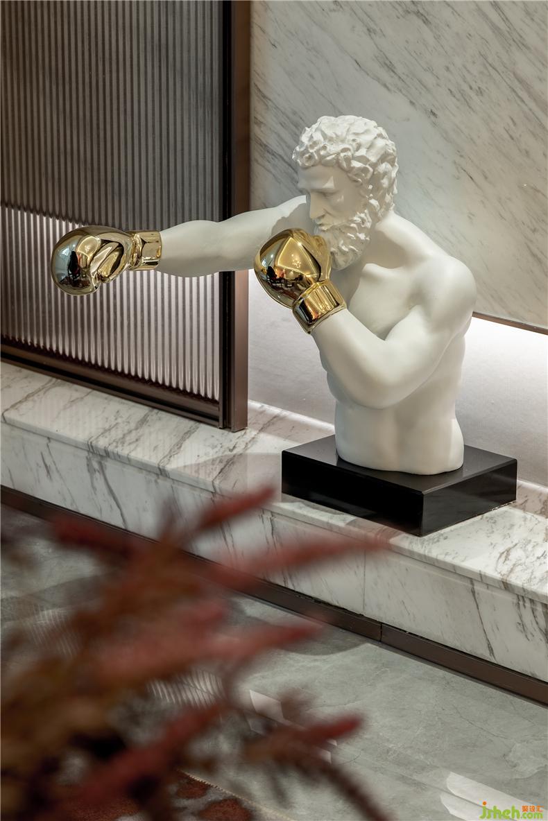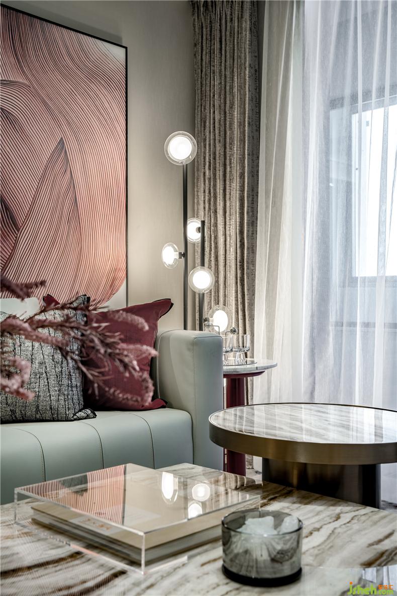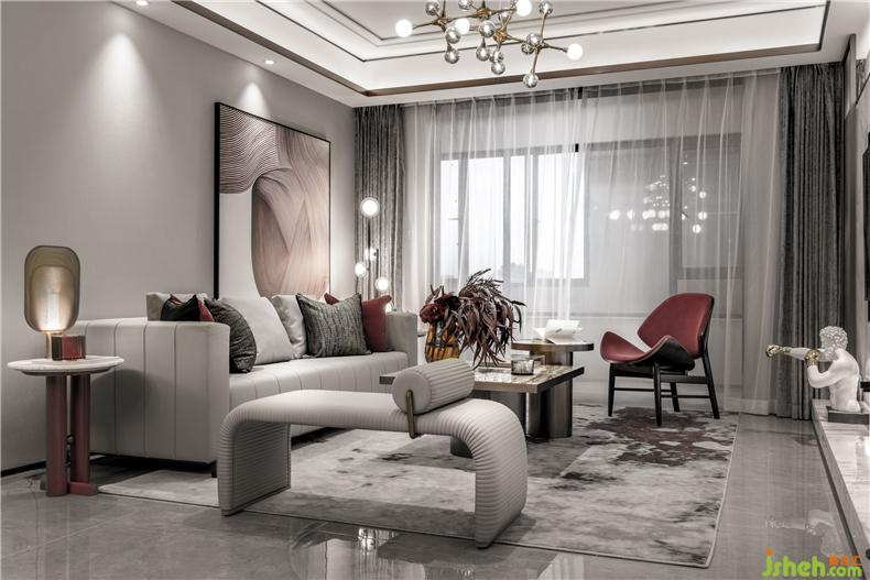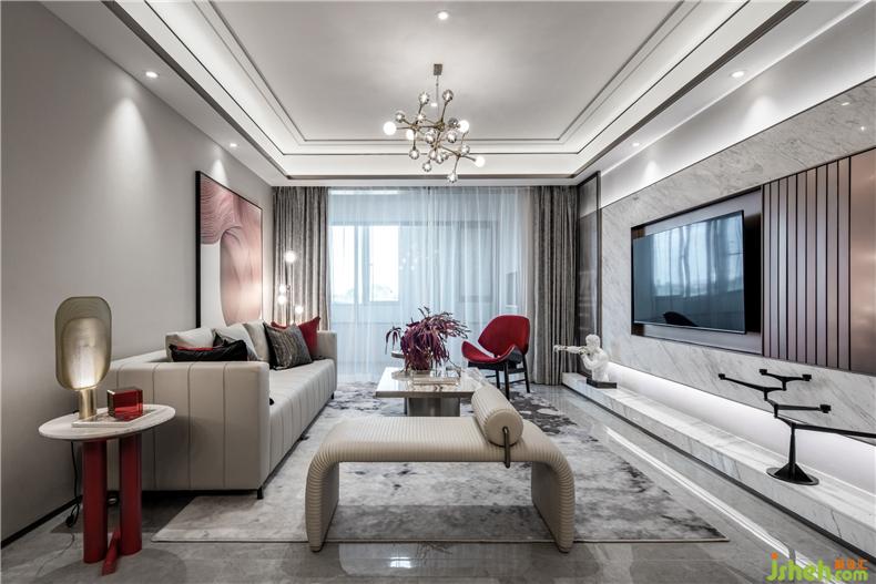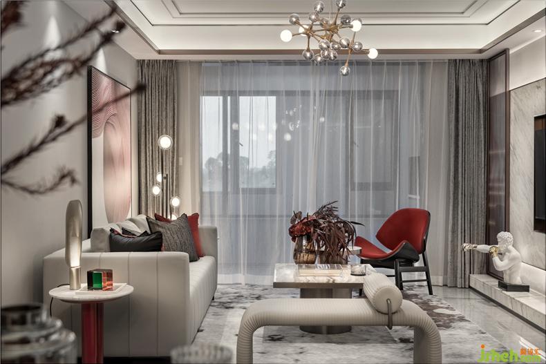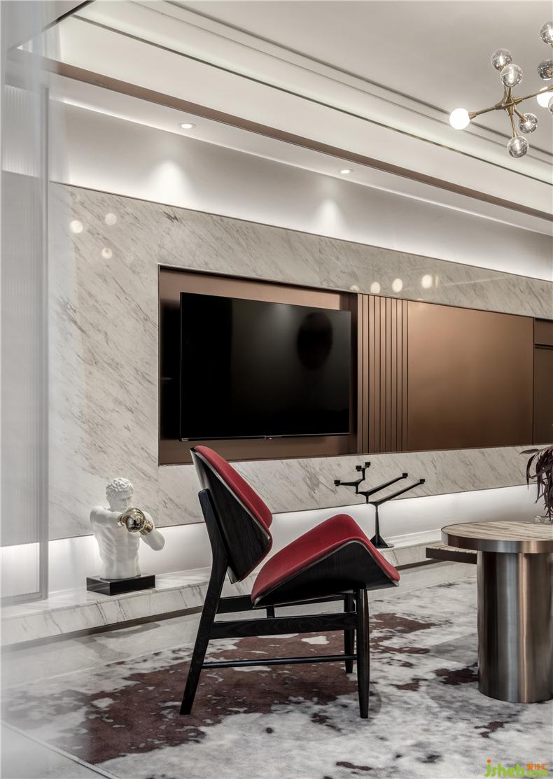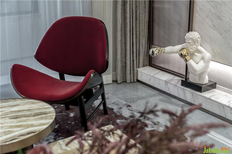 空間中石材和金屬的張力,感受利落質(zhì)感,干凈冷冽的空間增添一些柔和質(zhì)感。紅白用色,樣板房設(shè)計(jì)內(nèi)斂雅奢;柔軟的布藝和精致的配飾達(dá)成陰陽平衡的調(diào)和。增加了底色的豐富和柔和,朱砂色元素的使用使空間多了幾分復(fù)古典雅。