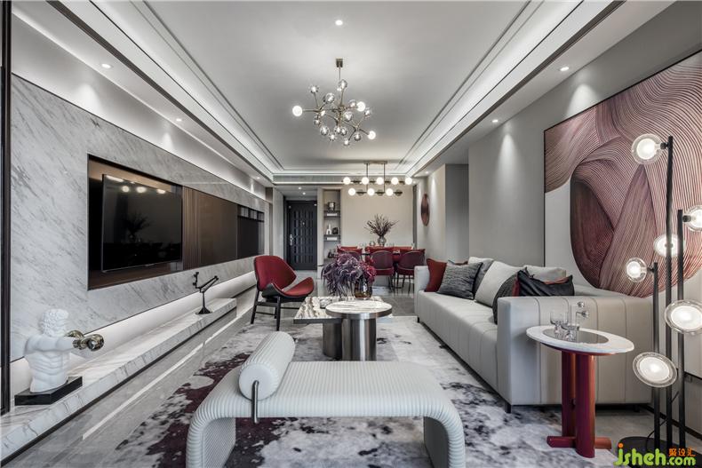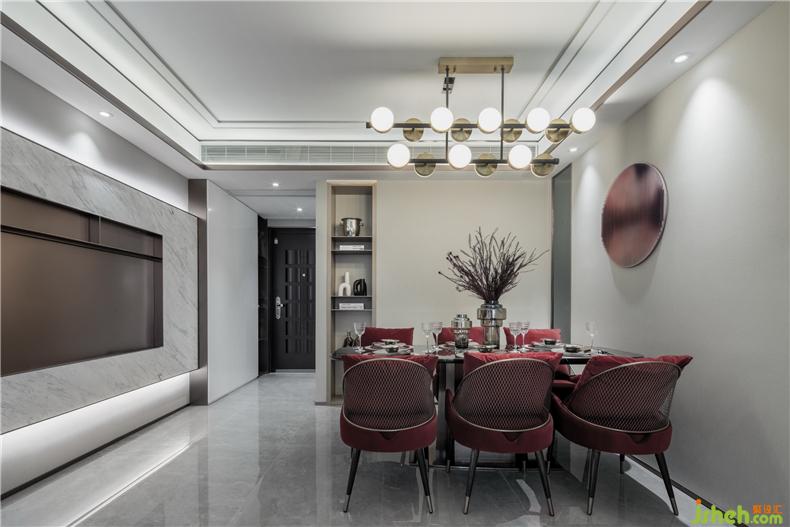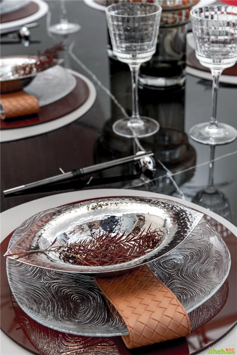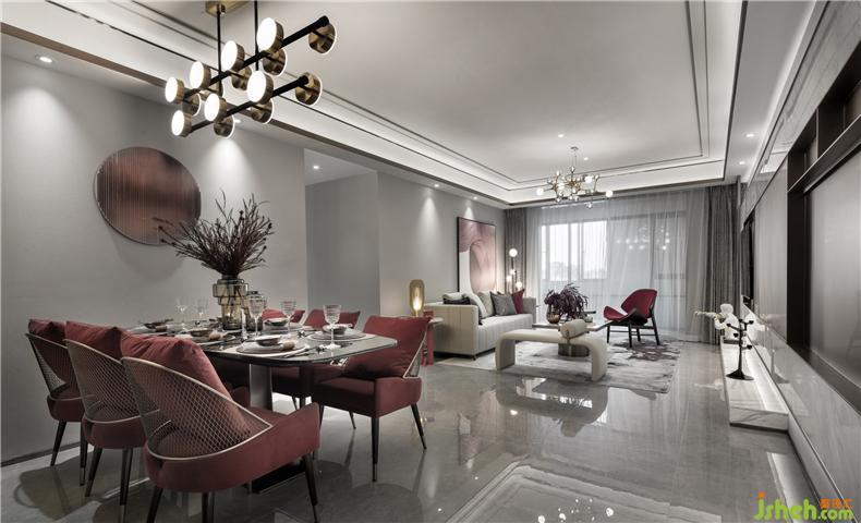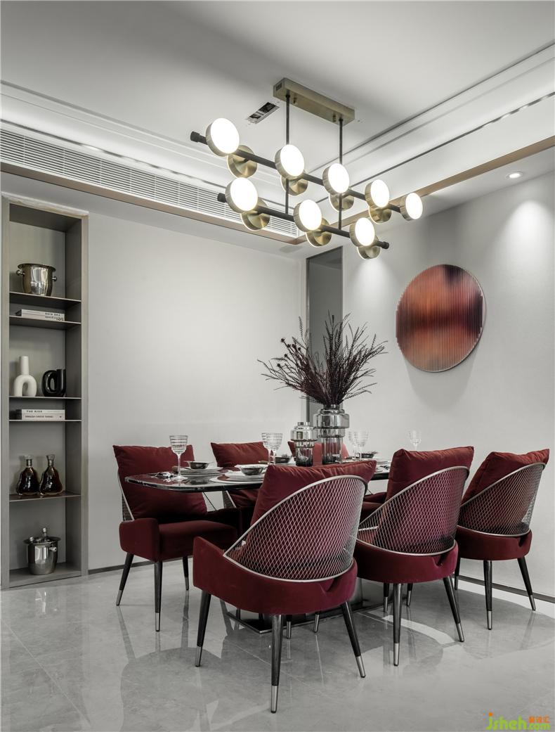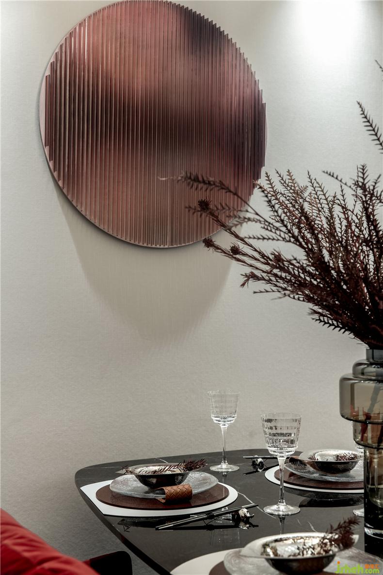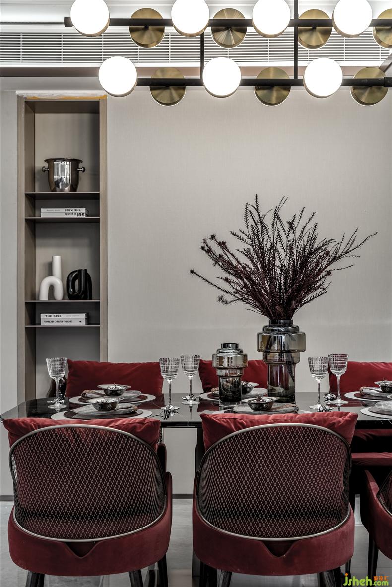 紅色綢面的餐桌椅交替搭配使餐廳空間多了一些活潑和韻味。樣板房設(shè)計(jì)具有淺灰花紋的透明花器配輕奢金色的藝術(shù)燈具則提升了幾分奢華感,金屬與琉璃組合的餐具也再一次起到了遙相呼應(yīng)的小精致