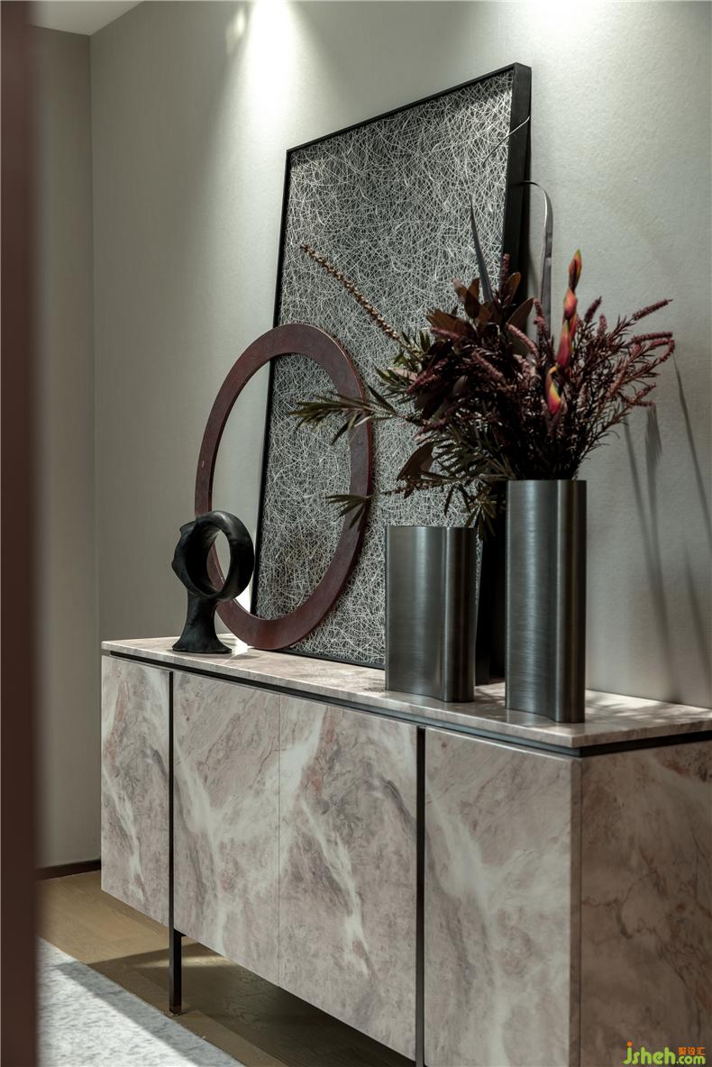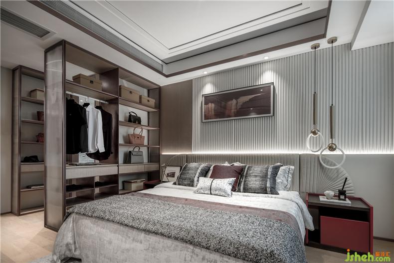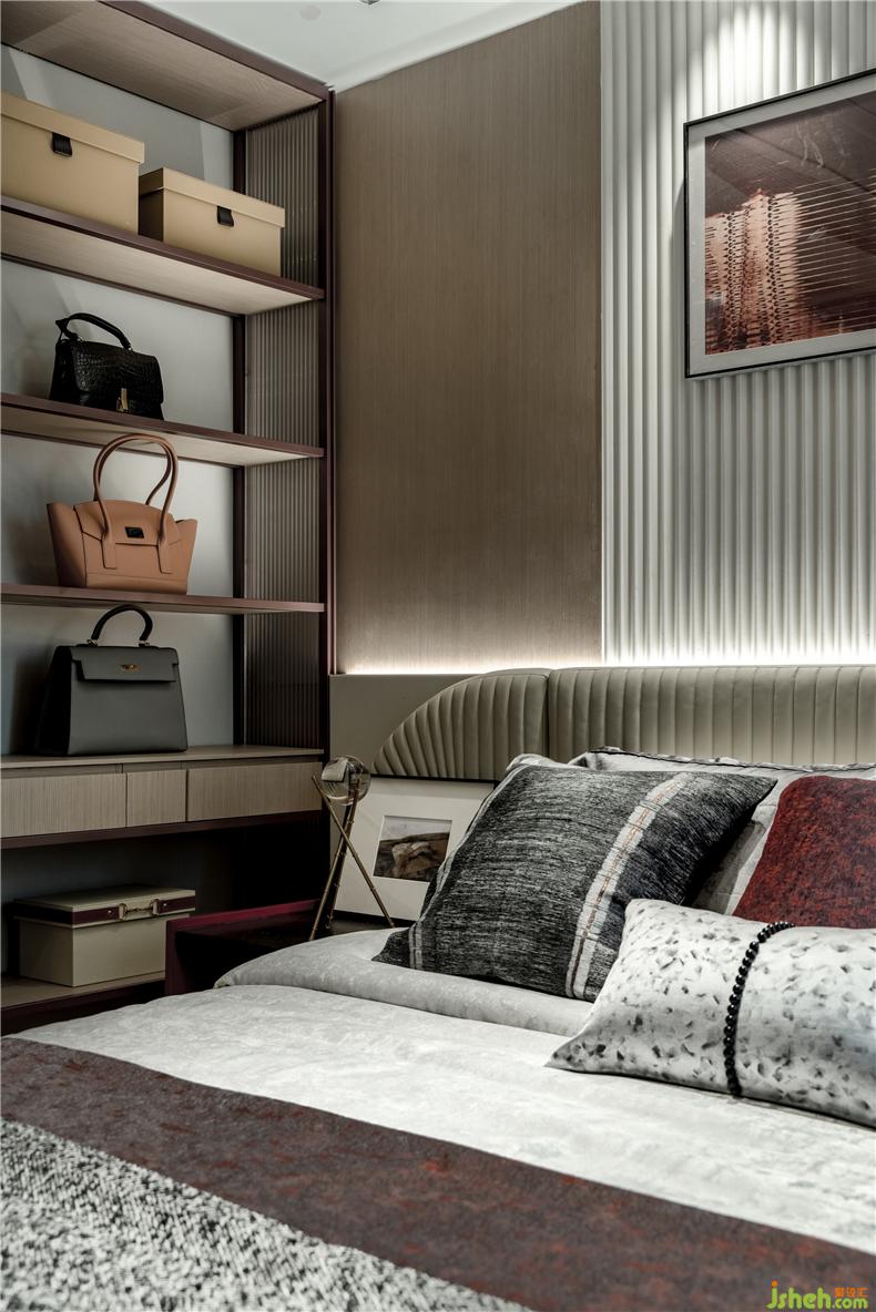 合理的布局和空間設(shè)計(jì)是衣帽間的基礎(chǔ),深灰色的木質(zhì)衣櫥更具高級感。領(lǐng)帶、包包、樣板房設(shè)計(jì)香水放置區(qū)的小設(shè)計(jì),也在彰顯著主人在生活品質(zhì)上的不妥協(xié)