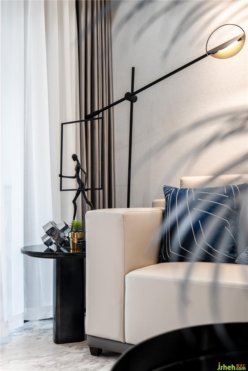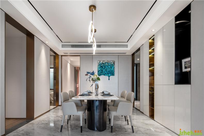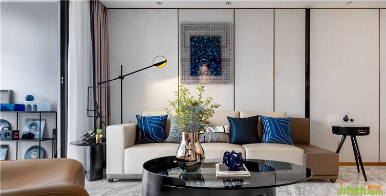 在軟裝陳設(shè)上,灰白基調(diào)配以深邃睿智的代爾夫特藍(lán)作為空間色彩跳躍,樣板房設(shè)計(jì)搭配香檳金屬材質(zhì)不銹鋼細(xì)節(jié),打造一個(gè)具現(xiàn)代臻品的迷人空間。