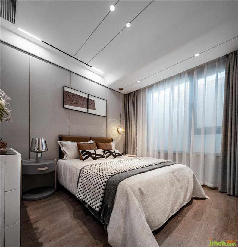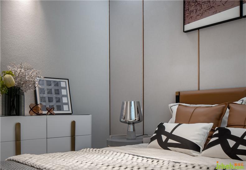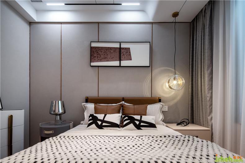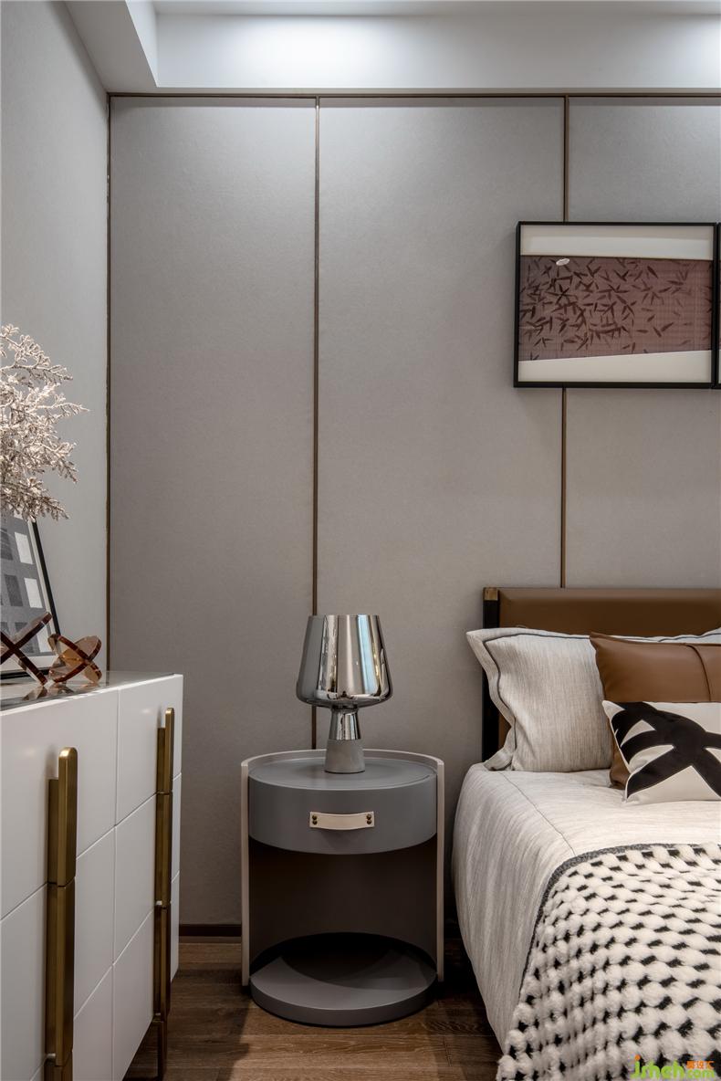 次臥空間在色彩上以寧?kù)o淡雅的咖色作為主基調(diào),跳躍的燈光作為點(diǎn)綴并置其間,形成光暈與材質(zhì)之間的強(qiáng)烈碰撞,讓整個(gè)空間場(chǎng)域呈現(xiàn)出簡(jiǎn)璞自然而不失靈動(dòng)與貴氣的氛圍。