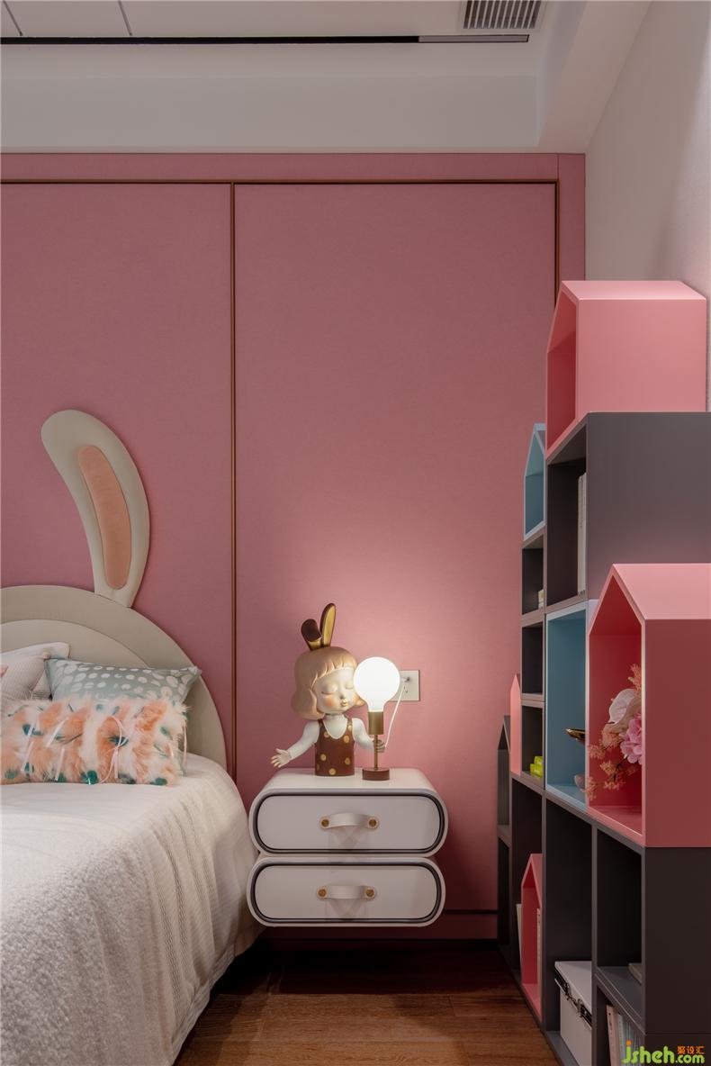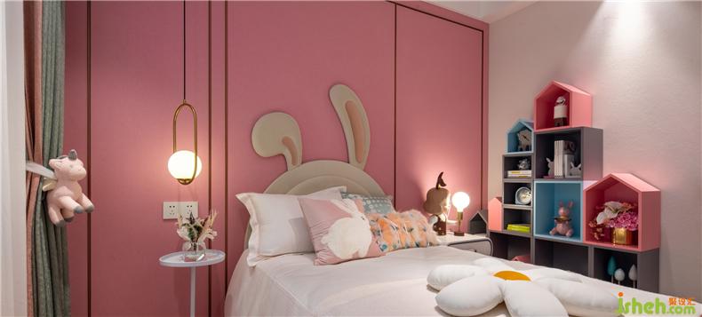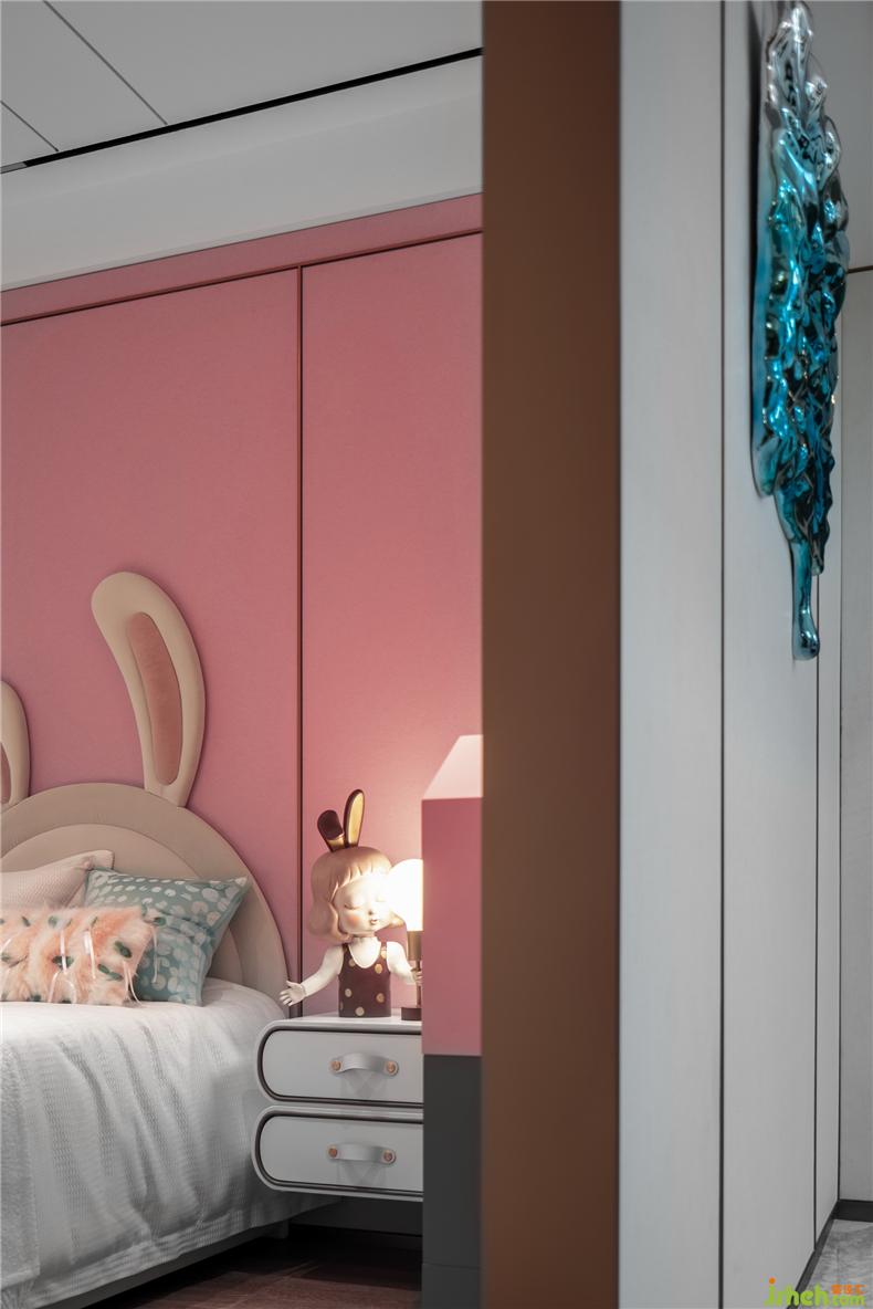 女兒房的設(shè)計(jì)以兔子為主題,充滿少女心的馬卡龍色調(diào),精致可愛的兔子元素,樣板房軟裝設(shè)計(jì)結(jié)合燈光,構(gòu)筑孩子心目中夢(mèng)幻、意趣而又溫馨的童話世界。
