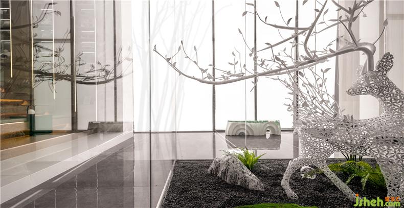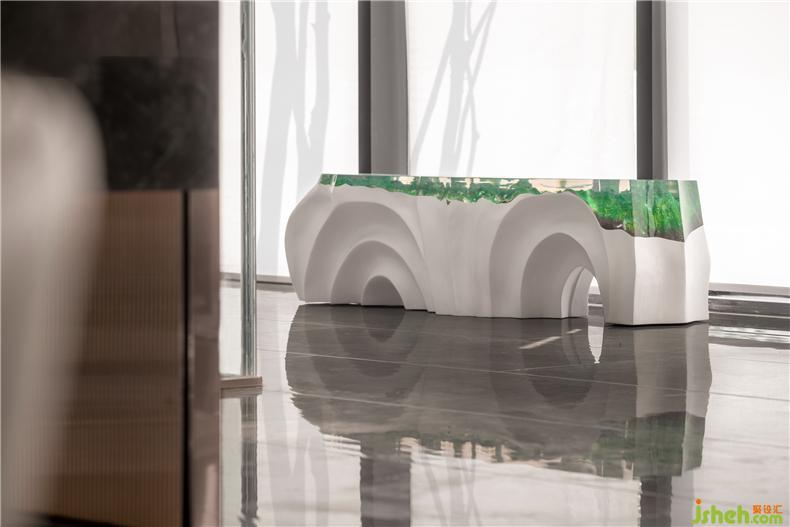 代表生機的綠色讓空間節(jié)奏跳躍,一旁置放著玻璃鋼與手工樹脂制作的科技琥珀長凳,營銷中心設(shè)計打破大空間的沉悶,提取低飽和的森林色彩,搭配動物與植物的形象提取、元素組合,自然柔和,舒適干凈