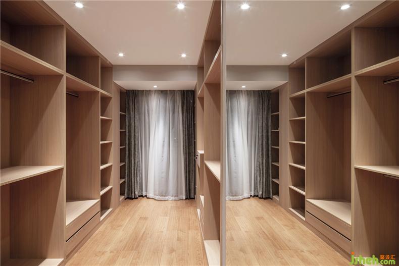 在主臥旁,單獨設(shè)置一個房間作為步入式衣帽間,私宅定制設(shè)計可以充分滿足儲物收納的需求