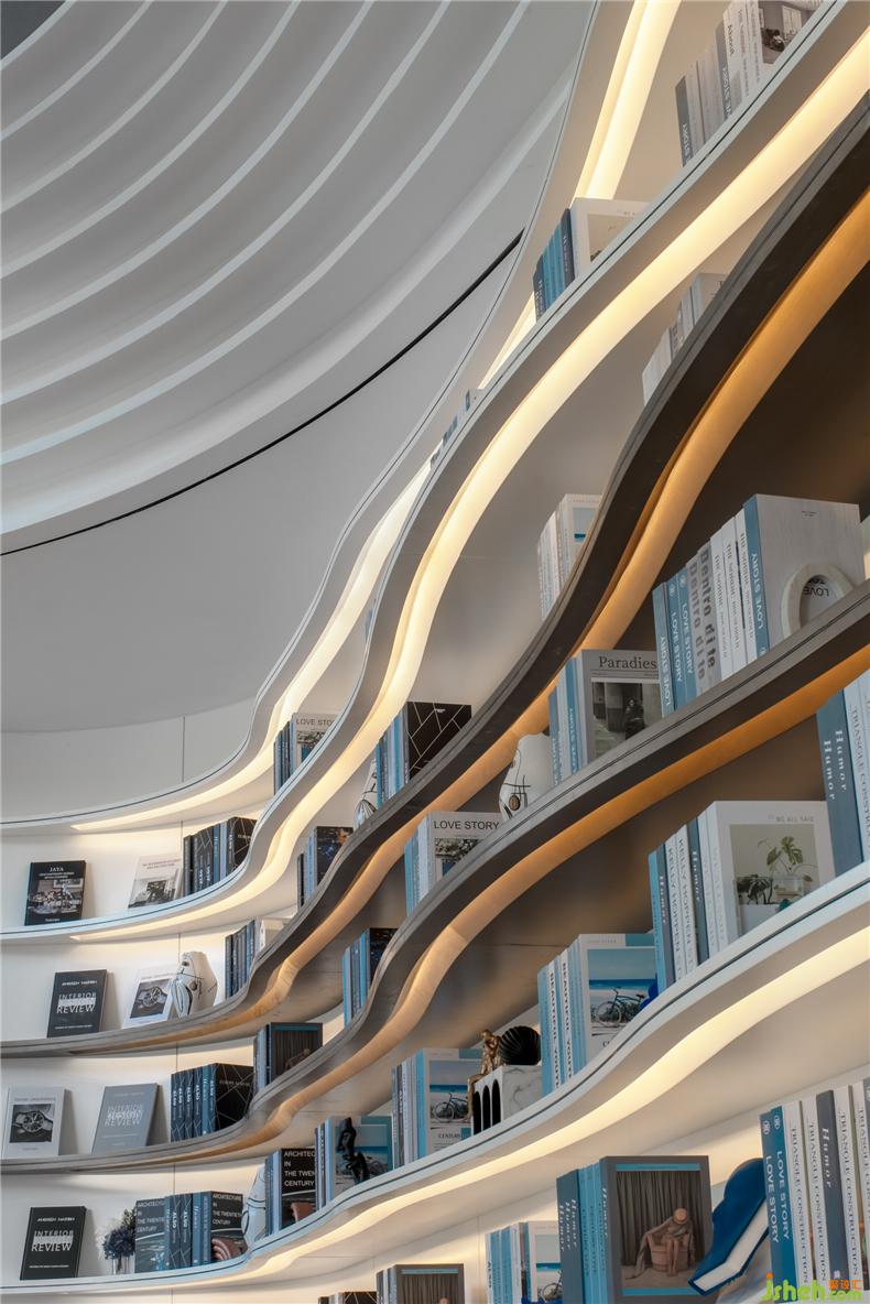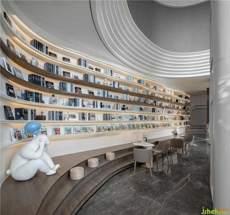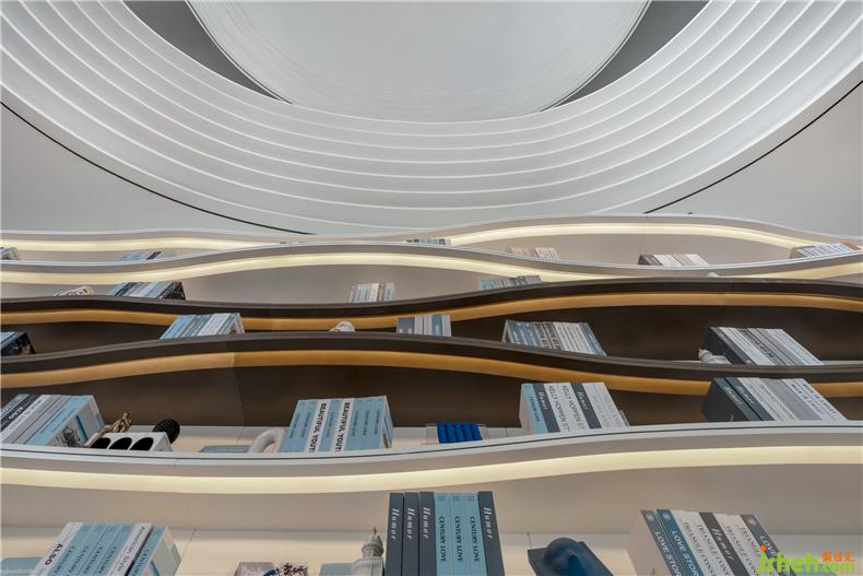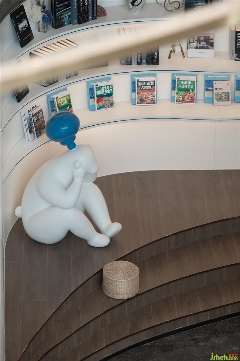 書吧空間都是開放式的,在書墻的下方還有同樣波紋形狀的可入座臺階,供閱讀者稍作休憩,拉近人與人之間的距離。在臺階的一側(cè)更是矗立著一個活潑可愛的卡通小熊IP裝置,讓不管是成人還是孩童都能在書吧享受到逃離都市喧囂的片刻寧靜。