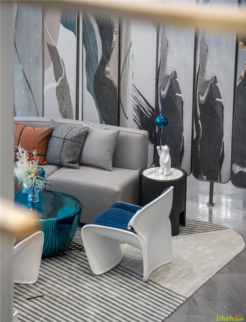 商務(wù)洽談區(qū),極簡形式的茶座組合讓人步入其中就不自覺的放松,而在咖啡與茶香的濃香中,藍色橙色交相輝映,帶出深度洽談區(qū)的悠遠寧靜。
