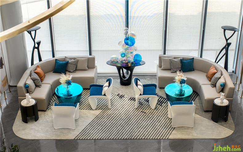 炫彩玻璃鋼茶幾是整個深度洽談區(qū)的重點,夢幻如泡沫的立體裝飾雕塑更是整個空間的重心,左右兩側(cè)是對稱的沙發(fā)桌椅,空間和諧柔美又不失高級。