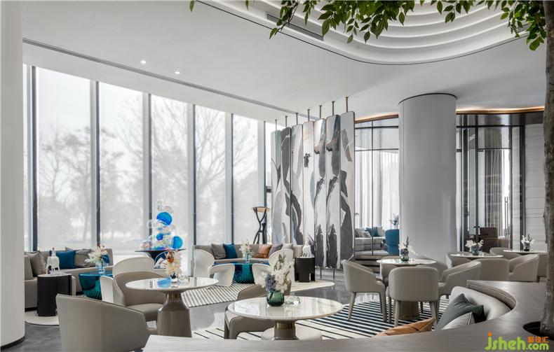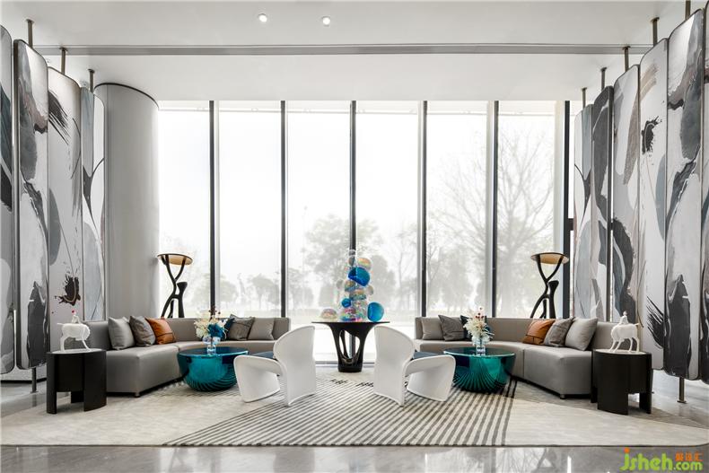 亞克力材質(zhì)的泡沫裝置工藝繁復(fù),光澤透亮,充滿現(xiàn)代感,讓人仿佛置身于充滿夢幻色彩的湖泊海洋,營銷中心設(shè)計滿室旖旎。沙發(fā)一側(cè)的小型藝術(shù)裝置,是空間的雕塑感的延伸,充滿了寧靜獨特的氣質(zhì),與整個空間融合,產(chǎn)生一系列微妙的變化。
