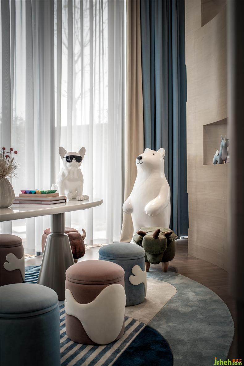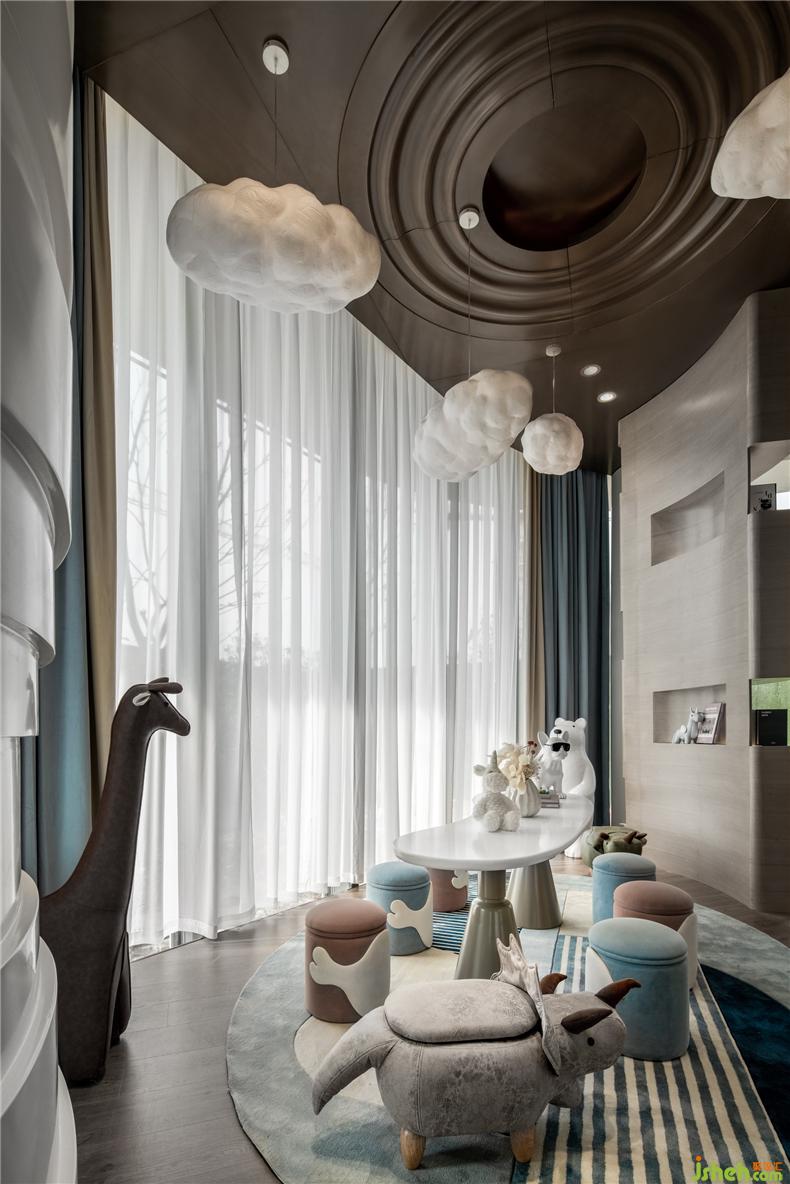 以動(dòng)物為主題的兒童區(qū),色彩豐盈,童真童趣,體現(xiàn)出空間的層次感。天花板上垂落的白云燈是自然生態(tài)的體現(xiàn);隨處可見的動(dòng)物裝飾活潑可愛;以閱讀和手工為主的臺(tái)面柔和純凈;可儲(chǔ)物的座椅以及再次出現(xiàn)的卡通小熊IP,營銷中心設(shè)計(jì)兒童區(qū)所有的元素集合能讓家長放心的讓孩童在此享受到愉快的時(shí)光。
