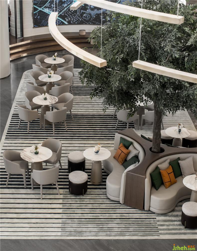 從二層往下,透過大型水波紋吊燈,商務(wù)洽談區(qū)的卡座若隱若現(xiàn),大理石材質(zhì)的臺(tái)面泛著微光,實(shí)現(xiàn)鏡像與空間的交融,在綠茵的映射下,充盈自然的趣味。