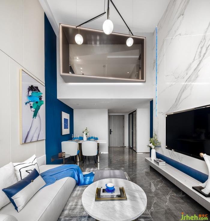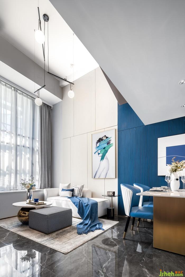 本案以簡約的設計手法打造,著重凸顯出簡潔現(xiàn)代的空間質感,勾勒出一個科技感與舒適感并存的LOFT式高挑開敞公寓空間。推門而入,集客餐廳為一體的空間以清新的藍白色調為主,挑高的客廳空間開闊,明朗的幾何線條,在空間內自如游走。