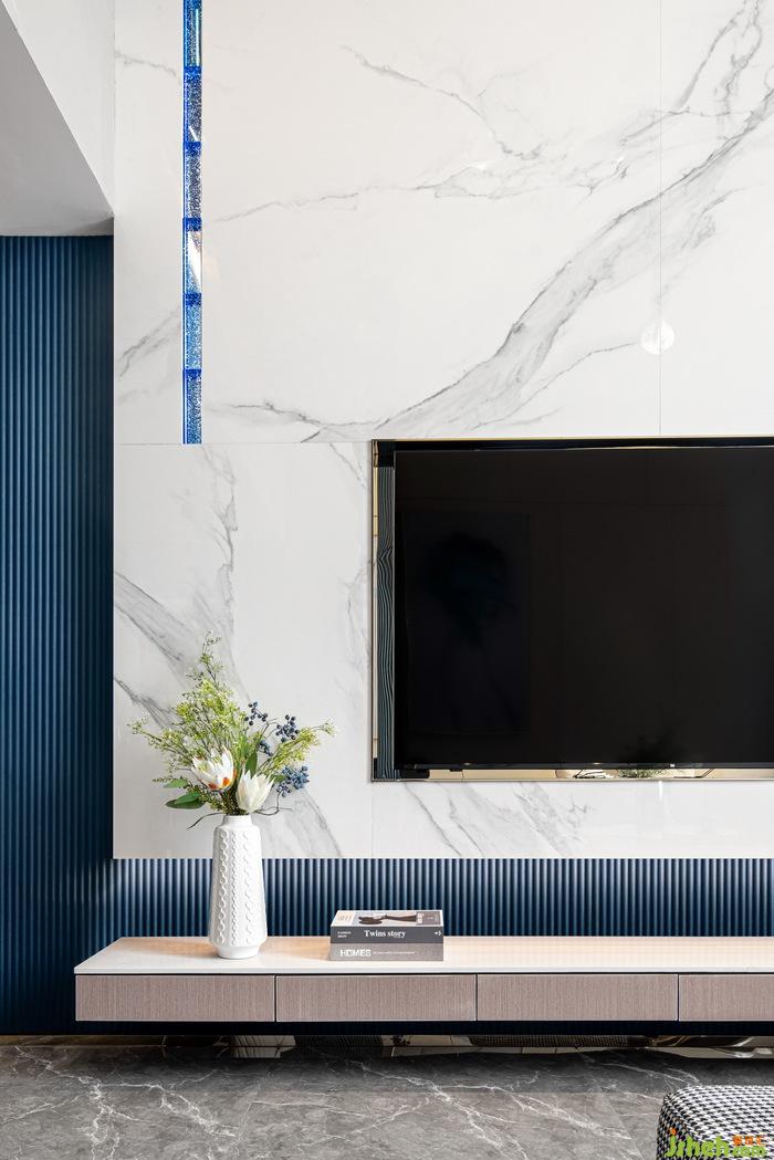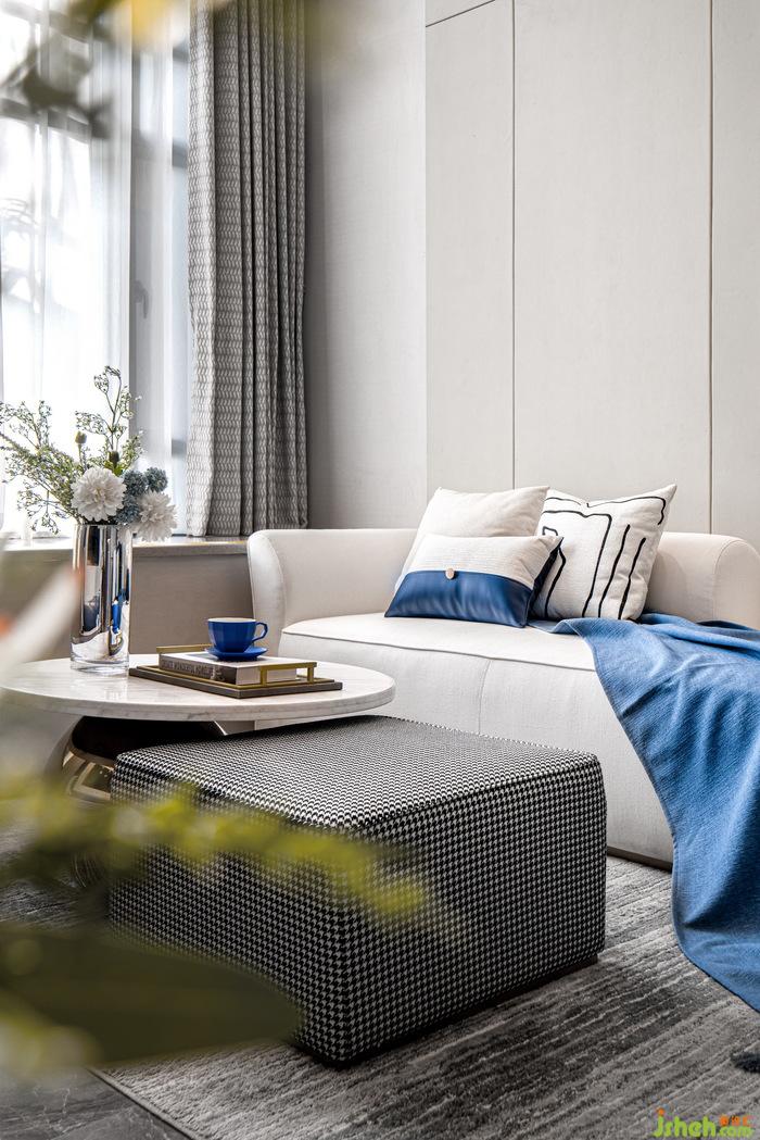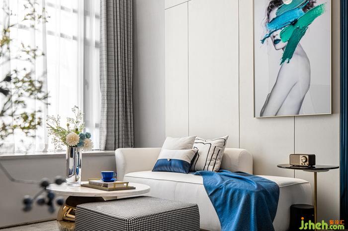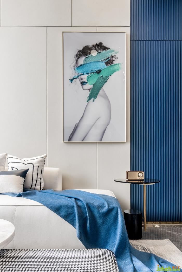 用簡白手法在打造空間尺度感的同時,在設計細節(jié)上也有諸多亮點。公寓樣板房設計師將充滿質感的靛藍和并不濃烈的淺色鋪陳在空間中,既不喧賓奪主,有提亮了整個空間。