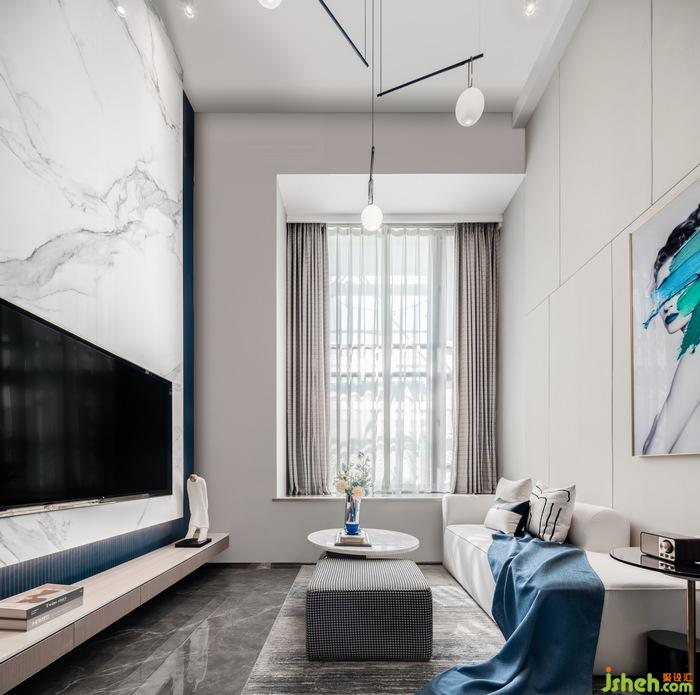 簡單并不意味單調,整面巖板電視背景墻紋理細膩,樣板房設計淺色簡約的沙發(fā)茶幾組合、時尚的裝飾畫、線條吊燈,交錯布局,方寸之間提升空間層次感,形成微妙的反應,清新自然。