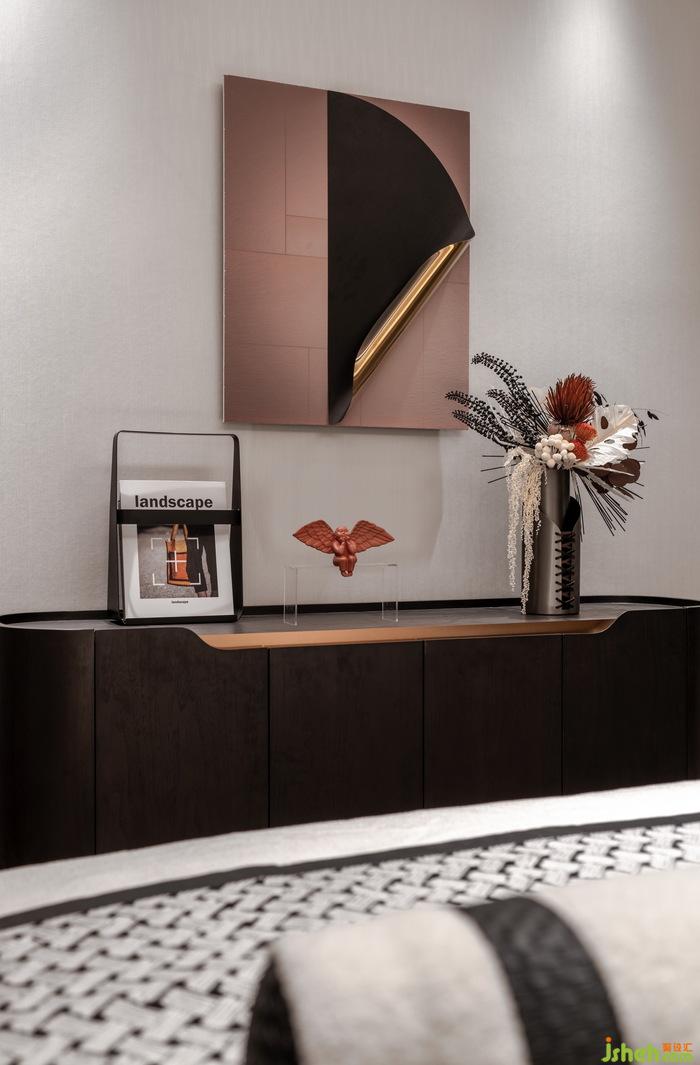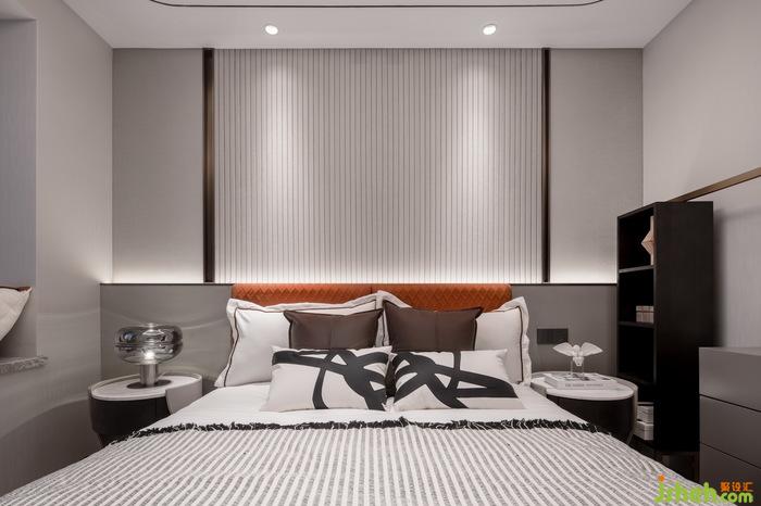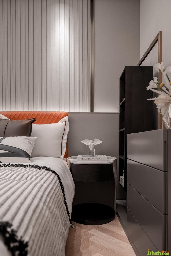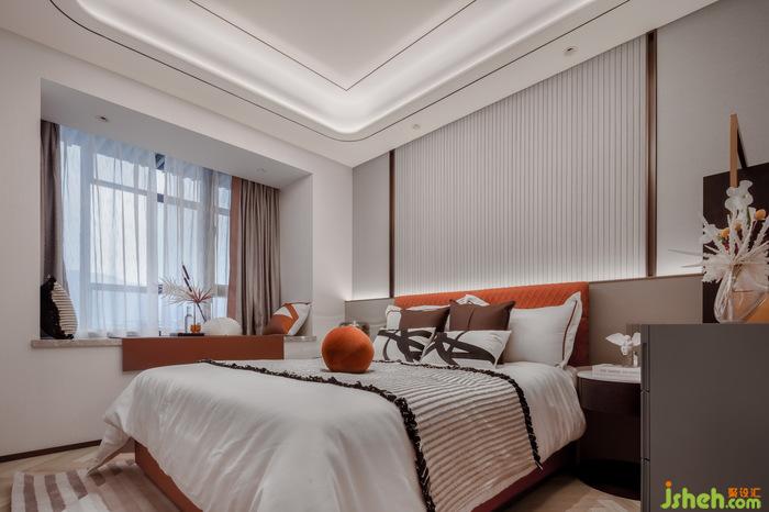 次臥也延續(xù)了空間的溫暖色調(diào),偏橘色的配色讓空間活潑明朗,飄窗上的精致小擺件與床頭的藝術(shù)壁燈空間的藝術(shù)氛圍感,簡(jiǎn)潔而不失時(shí)尚。