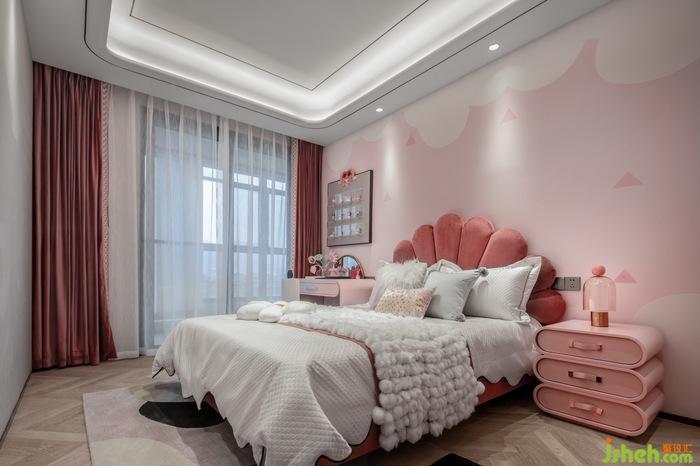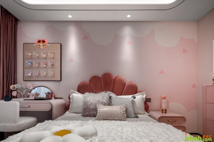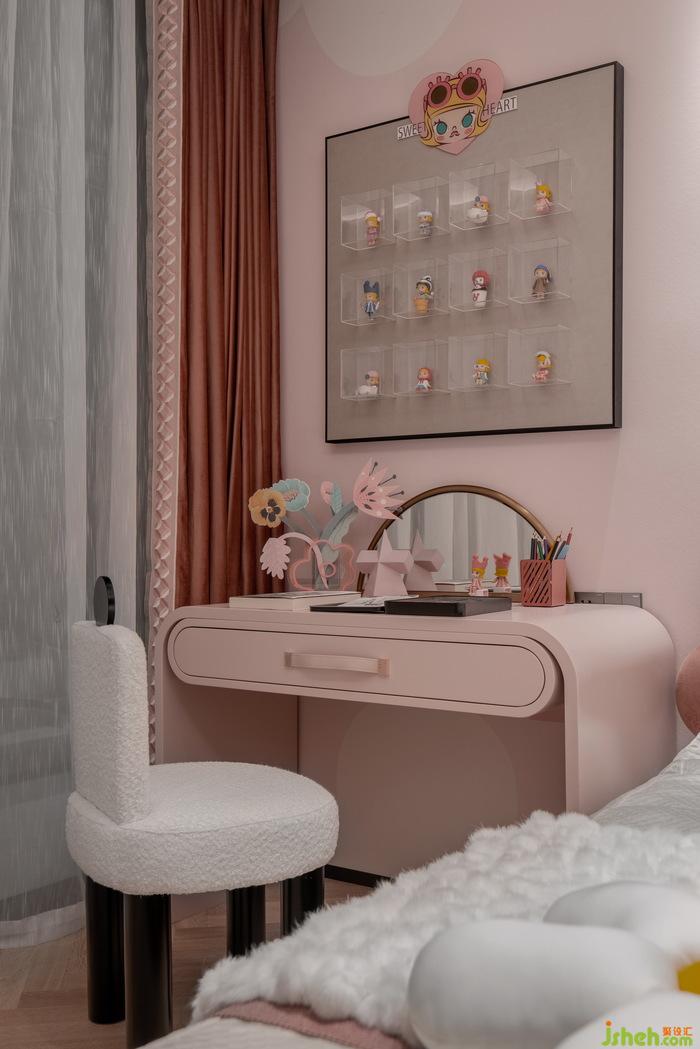 樣板房軟裝設(shè)計(jì)以粉色為空間基調(diào)的女孩房溫馨可愛(ài),云朵狀的床頭背景墻充滿童話故事的夢(mèng)幻感,定制的書桌與精心挑選的玩偶使得整個(gè)空間活潑,活力感十足。