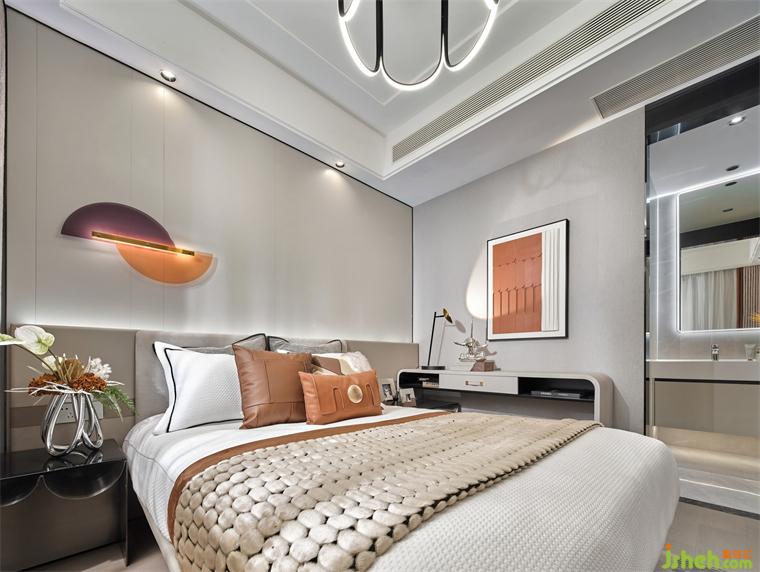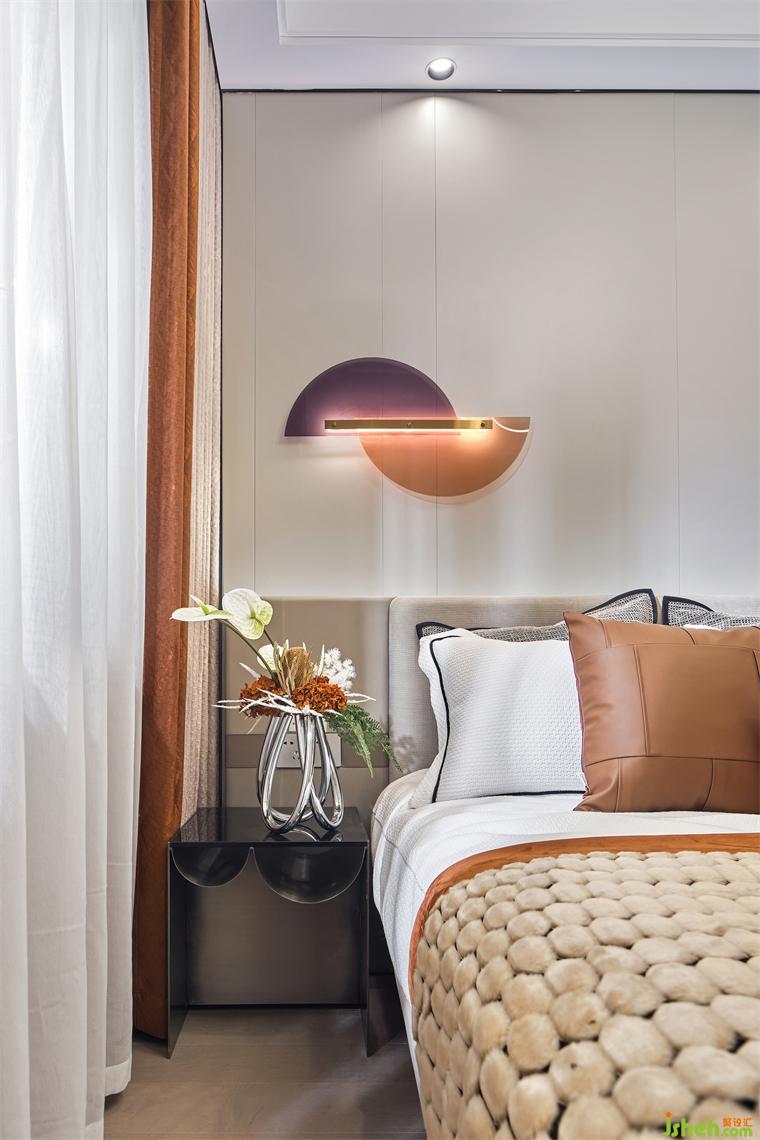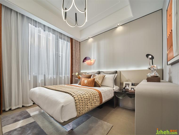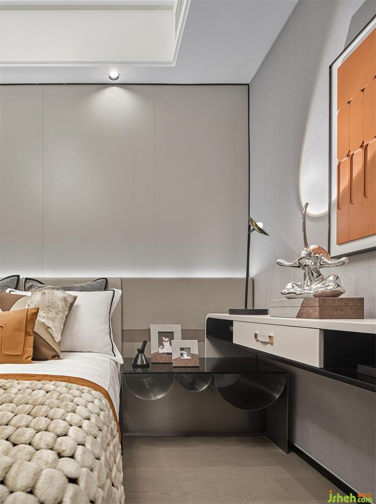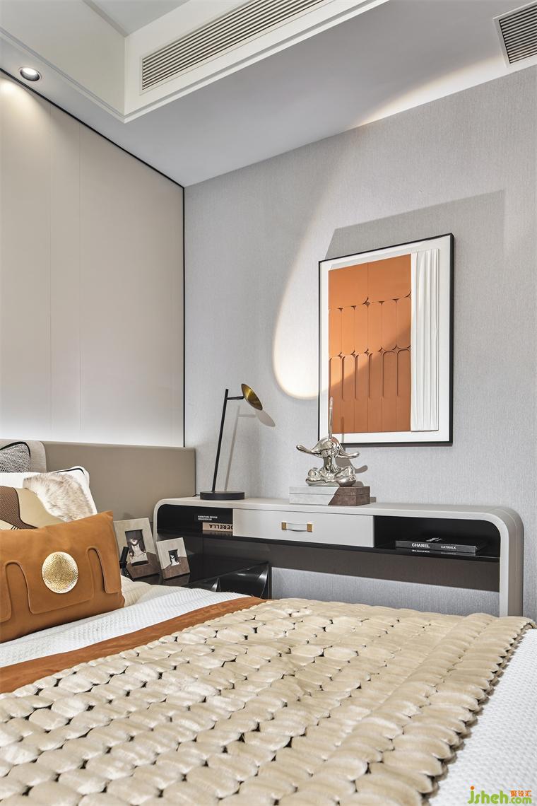 設(shè)計(jì)師在次臥的設(shè)計(jì)上,簡(jiǎn)約而又不失創(chuàng)造力和對(duì)實(shí)際需求的細(xì)致考慮,樣板房設(shè)計(jì)使用漂浮床的設(shè)計(jì),更好的把空間融為一體,而床頭靠背與床頭柜、邊柜相連,充分利用了空間,軟飾的配色予以不同層次的橙,加了空間層次感。