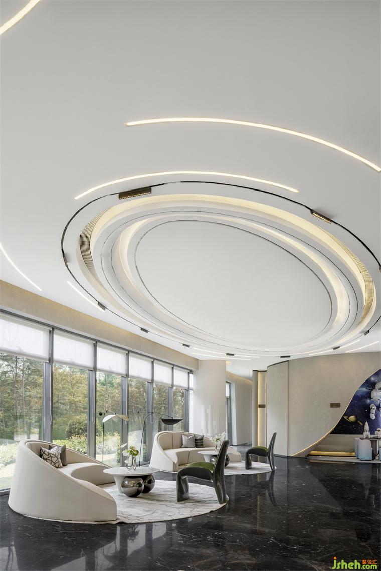 乳白的異形沙發(fā)、灰綠色的單人椅、售樓處設(shè)計淺色的大理石臺面圓桌與地毯,一切都是那么和諧柔美,讓人的身心似乎也得到了放松。