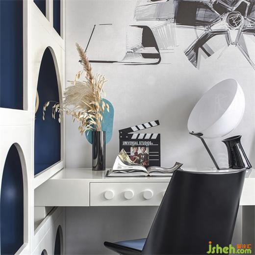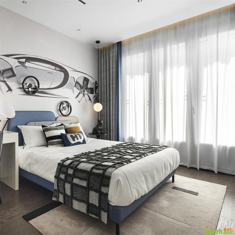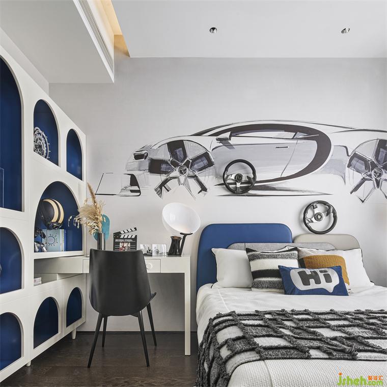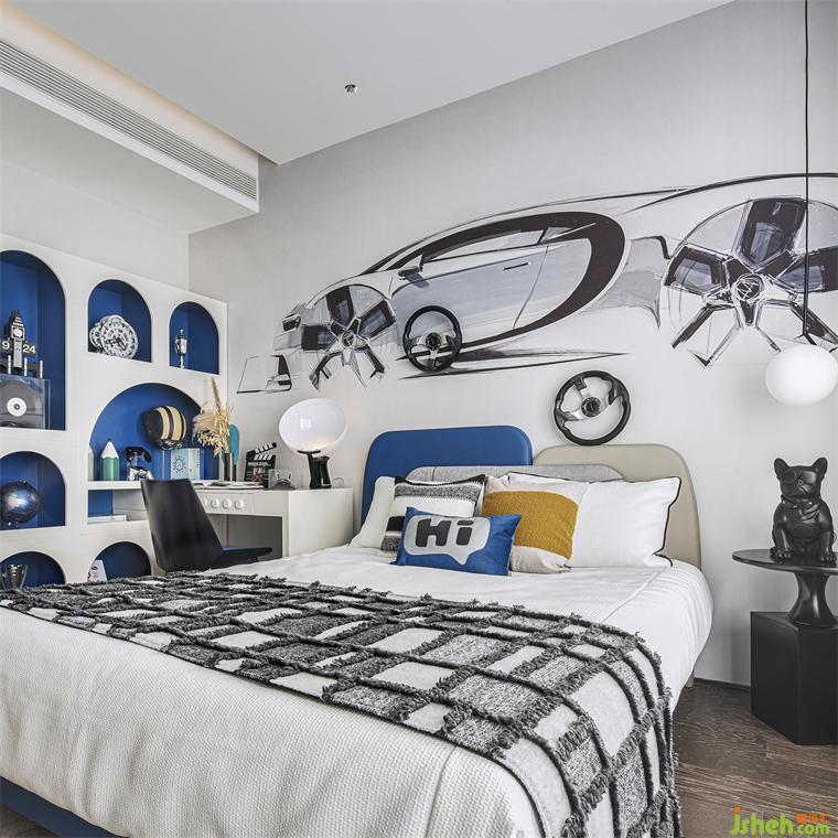 男孩房以快節(jié)奏的賽車主題,且為慢場景的藝術(shù)演繹而著相立形,一灰一藍(lán),在軟飾中升華趣志。