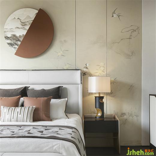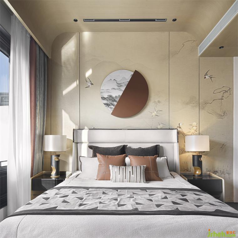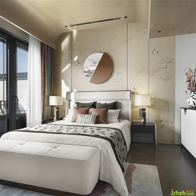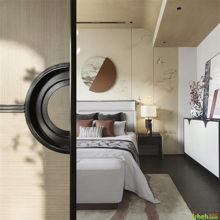 三樓主臥風(fēng)雅意境,既保留了古典東方的樣貌,又不失空間主題文化元素的交融呼應(yīng)。合院樣板房軟裝設(shè)計(jì)酣眠其間,仿若泛舟徜徉于碧波之上,喚起一派超然自若的愉悅境界。
