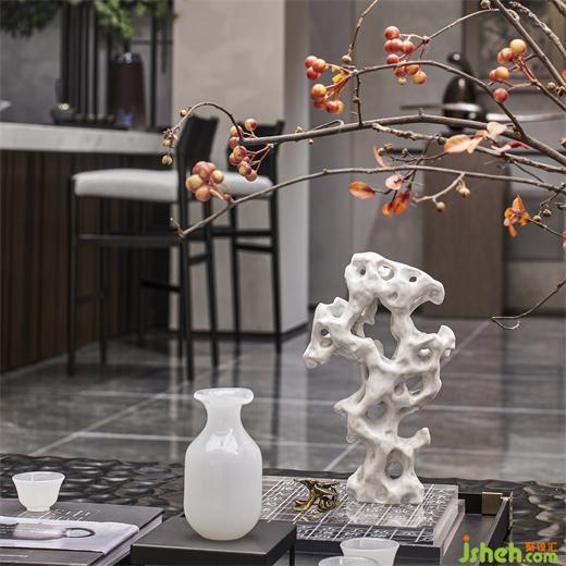 如果說休閑客廳為主,那么茶室為輔,通過開放場景,合院樣板房軟裝設(shè)計在空間里自由切換,配上東方現(xiàn)代的軟裝家具,呼應(yīng)別墅的典藏藝術(shù)氣質(zhì)。