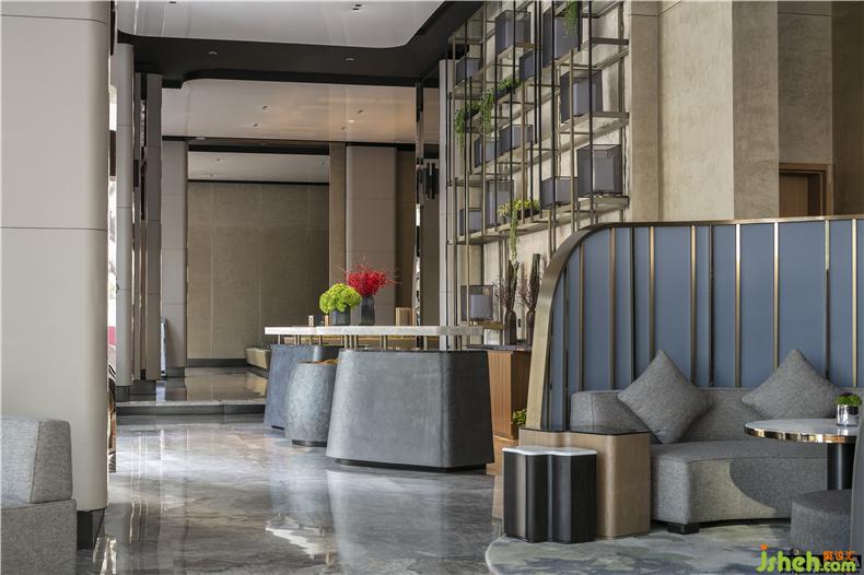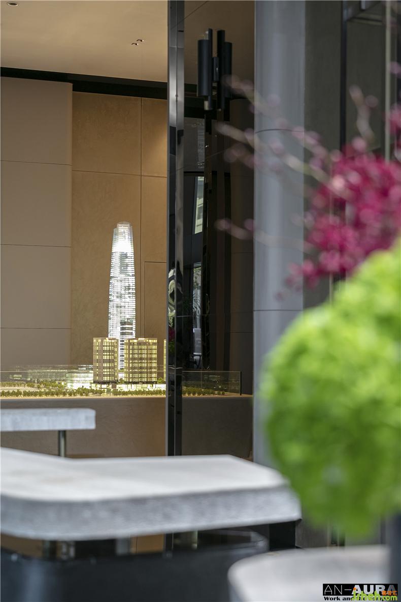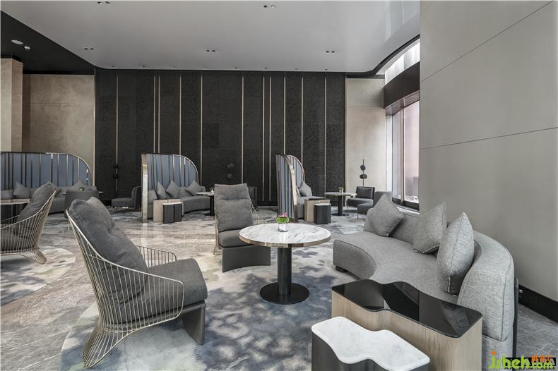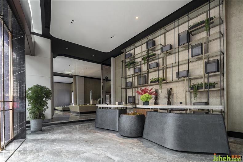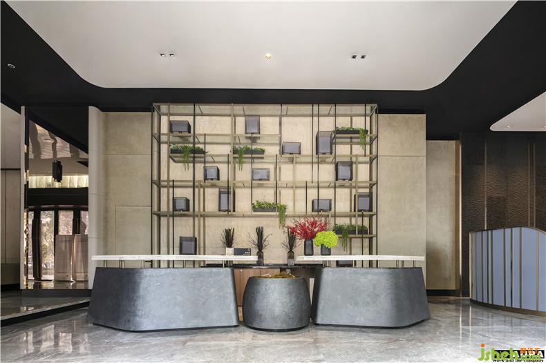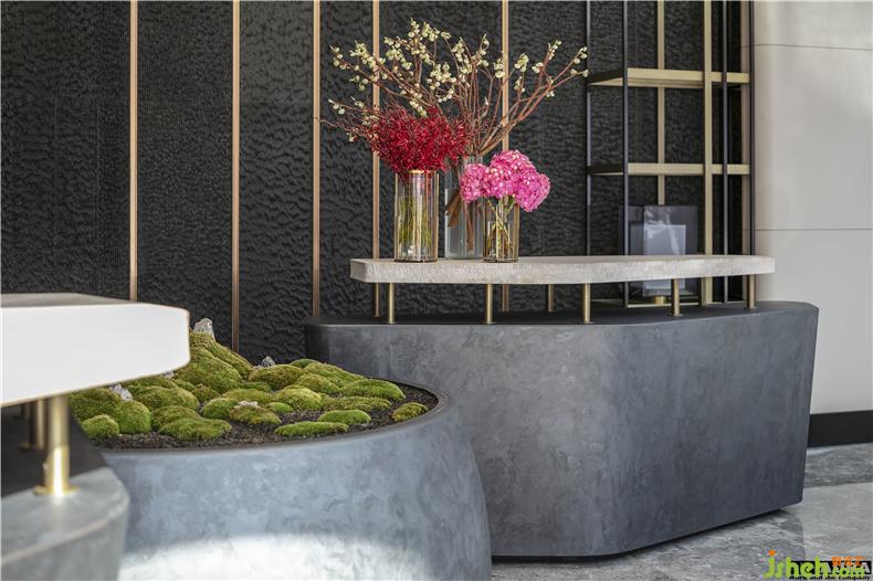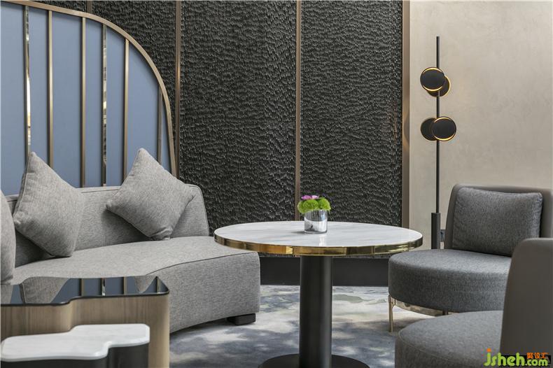 走進接待前廳,即見山水流云現(xiàn)于眼前,選取灰色大理石,青睞于水泥灰的高級與粗糲感感,營造出山的形態(tài),將燈具接待臺的景隱喻為重巒疊嶂的流云與山石。亞克力與金屬錯落的燈具,將光線彌漫開來,投映在石材與地面上,裝修設計渲染出現(xiàn)代的質樸美感。