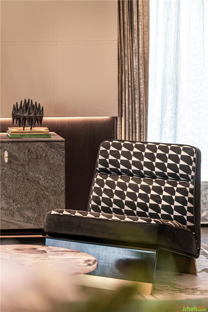 靠近電視墻的客廳角落,設(shè)置了一個(gè)Baxter的私人空間,主人回到家,光著腳踩在羊毛地毯上,樣板房設(shè)計(jì)可以舒服地坐在灰色格子紋沙發(fā)上,一杯咖啡一本書,書香人生。“很少人會用真的毛皮做地毯,純粹柔軟的觸感能給人以溫情的治愈力。