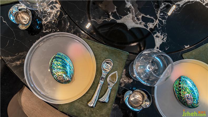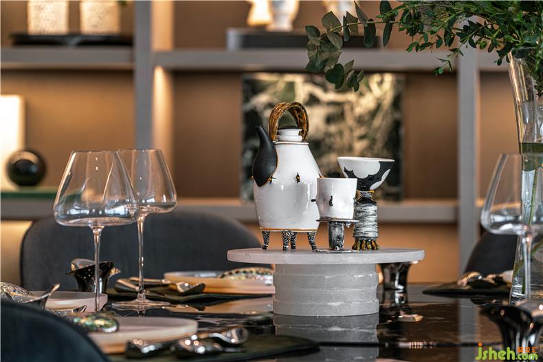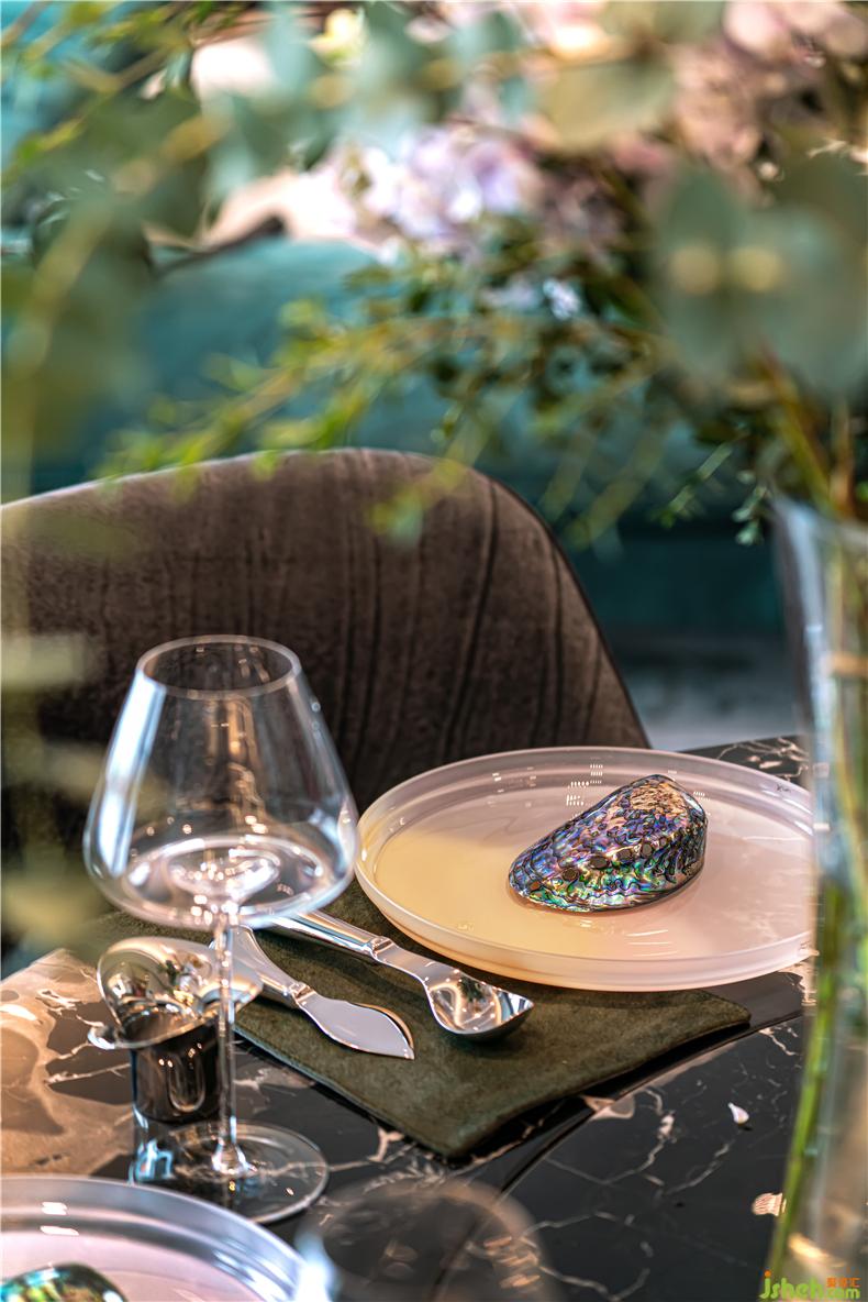 餐臺上放置的Studio Formafantasma手工制作餐盤,經(jīng)由乳白色材料吹制出彩色無定形色彩的顏料,質(zhì)地輕透如霧,每件都有獨(dú)特的肌理。桌子上的瓷壺和酒壺也是藝術(shù)家制作的。它們是獨(dú)一無二的手工制品,充滿了創(chuàng)造力和對生活的興趣。