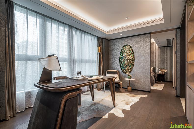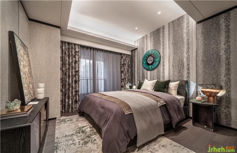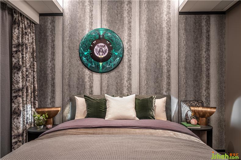 散落在床頭柜上,床邊櫥柜裝飾,不經意間突出了主人的生活體驗和藝術品位。樣板房設計這里不僅有歐洲回收的銅槍、小瓶子等,而且還有抽象畫作為裝飾和掛件,敏感的床上用品和家具質感,以提高空間的質量.