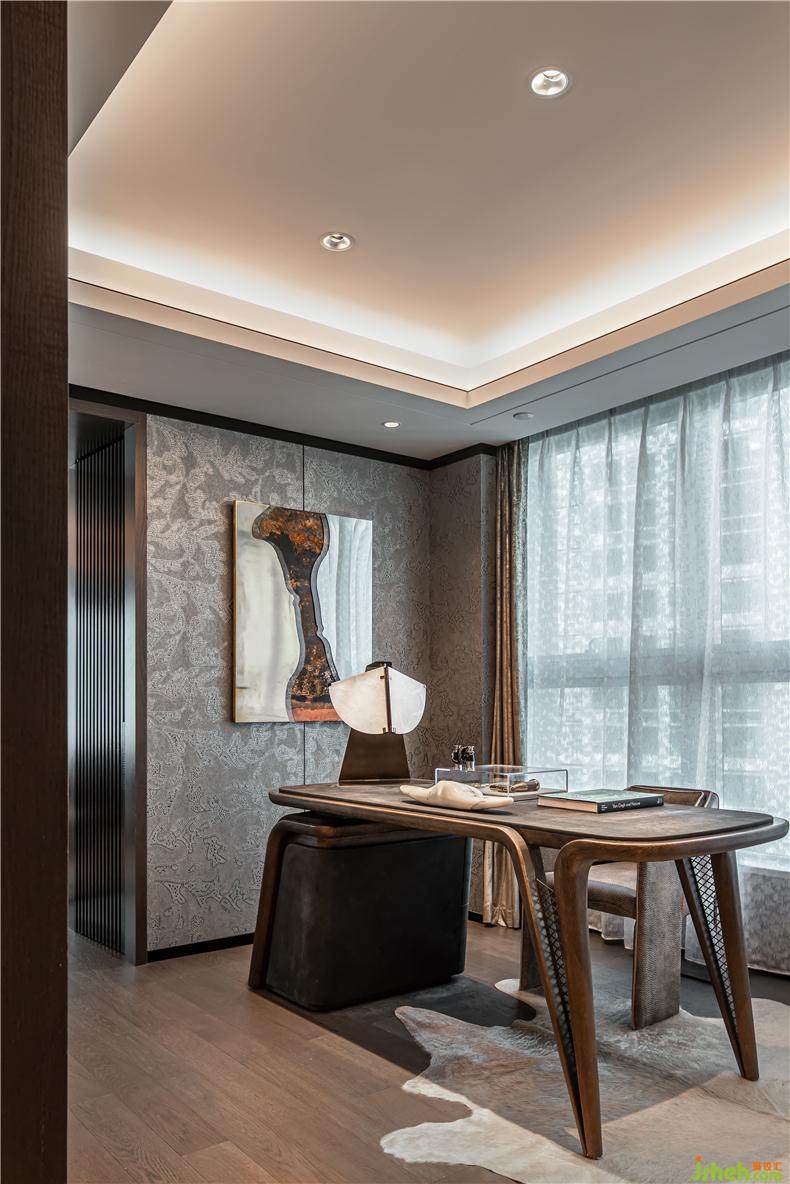 與書房相連的是床上用品、卷曲的壁紙和書房相同的顏色,順著貴族氣質。室內灰幕與墻紙同質化回聲,金屬質感造型獨特的燈具與灰色碰撞,冷感工業(yè)風氛圍,擁有復古時尚的美感.