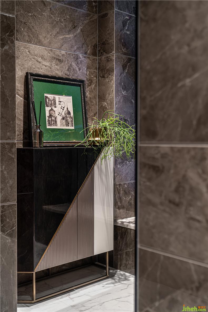 整體空間簡單而干凈,獨特定制的賓利Bingley書桌高貴而霸道,桌面皮革,細節(jié)完美拋光,呼應了墻上安裝工業(yè)風鏡的藝術風格。賓利皮革長凳的角落與金屬藝術裝置復古設計的經典時代致敬。剝離紋理地毯和灰度紋理和復古綠色對比,冷暖結合,豪華不言而喻.
