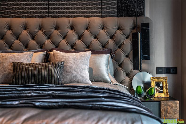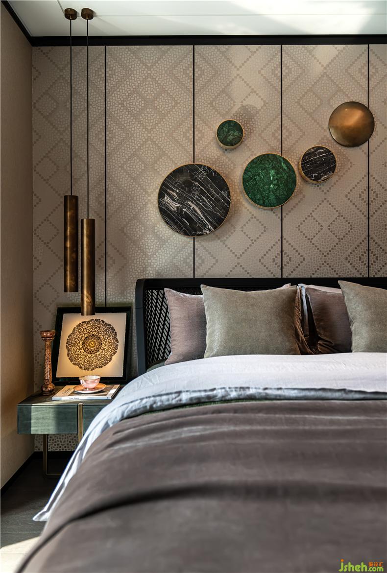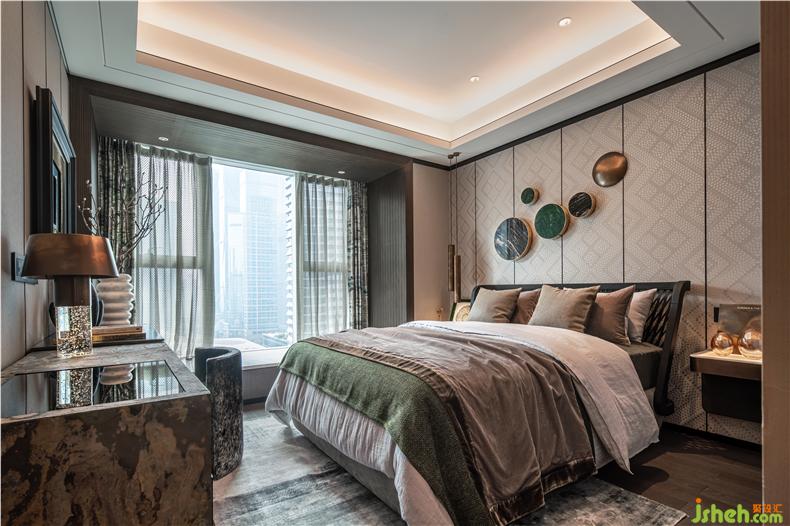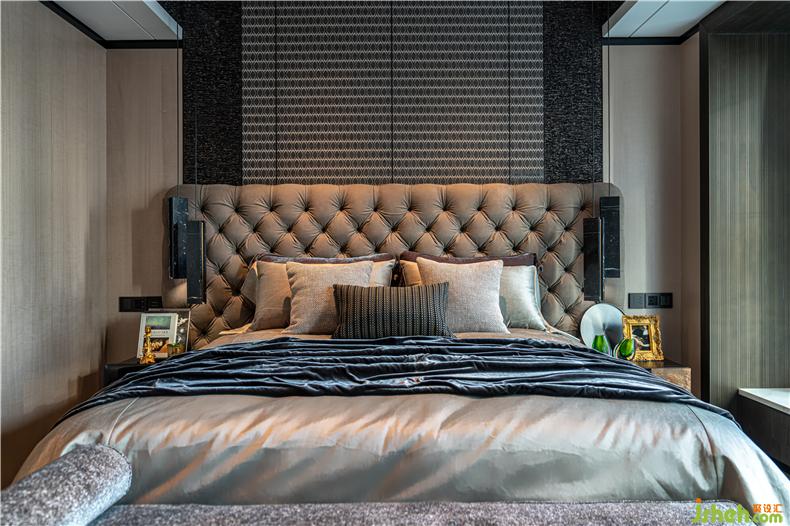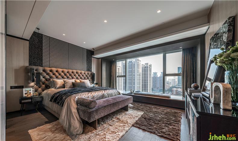 與主臥對(duì)應(yīng)的另一套端頭雙主臥,有著與主臥相同的中央大街繁華窗景,設(shè)計(jì)師將窗外的都市景致引入室內(nèi)空間環(huán)境中,搭配灰色沙龍質(zhì)感墻紙,內(nèi)外呼應(yīng)。靈感來(lái)自于超現(xiàn)實(shí)主義內(nèi)飾,傳達(dá)當(dāng)代時(shí)尚輕奢風(fēng)格.