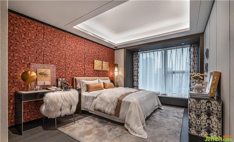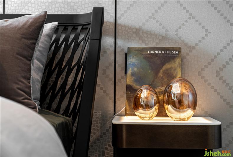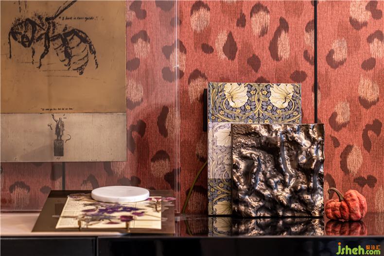 床頭采用大面積的暗紅色蝶影波點Eijffinger墻紙,來自歐洲的百年品牌Hague,以用色大膽、設計創(chuàng)新著稱。家具的暗紋亦是以蝶變?yōu)橐庀?,與墻紙呼應。