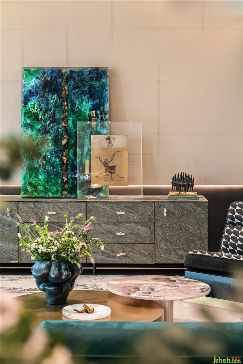 搭配客廳復古綠色的基調,電視柜臺上亦放有一幅綠色印象藝術作品,與地板、墻壁和家具的色彩中碰撞出復古的現(xiàn)代時尚感。藝術家畫作取義雨澤碧草,利用立體構成、色調間的自然變化與對比色的互補形成強烈反差,即冷靜深沉,又熱情奔放,如現(xiàn)實與夢境的融合與對照。