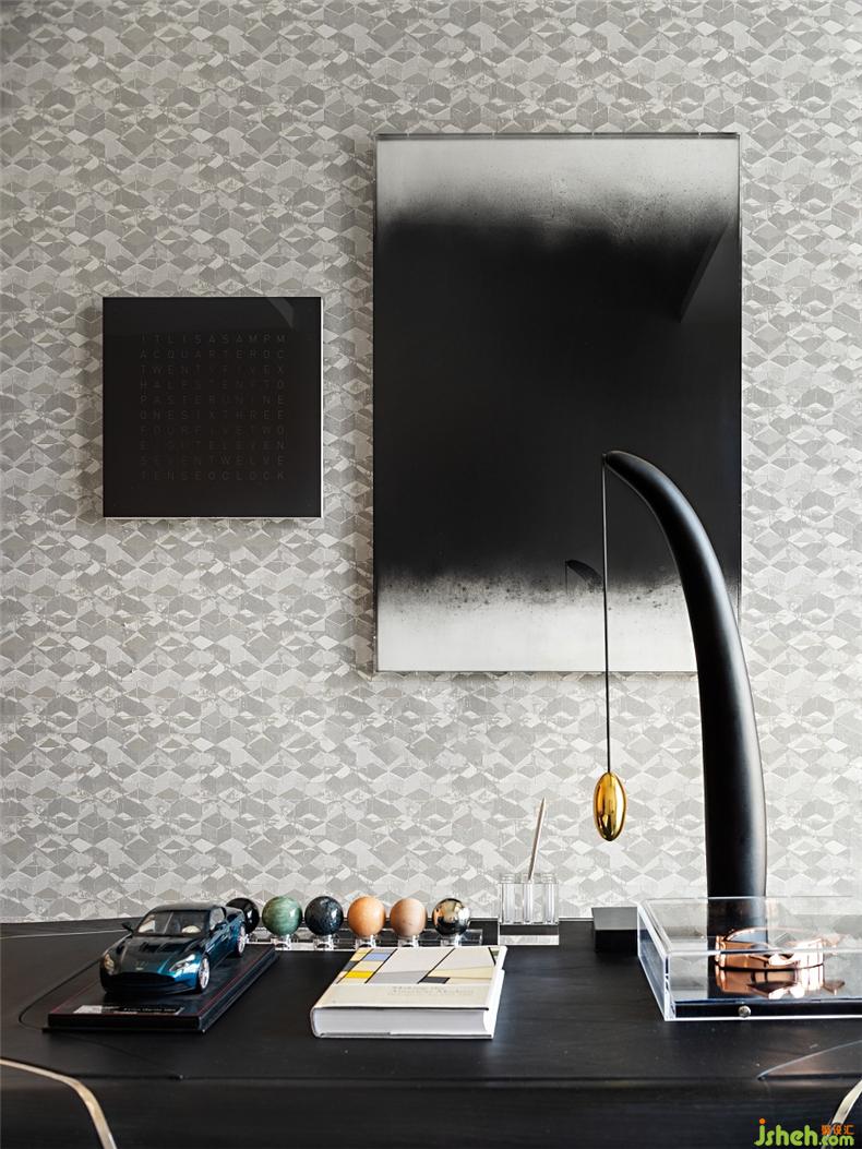 書房延續(xù)整體設(shè)計(jì)理念,以動(dòng)感的流線型書桌與辦公椅定下空間基調(diào),結(jié)合模擬光的前沿藝術(shù)裝飾畫和Qlocktwo創(chuàng)意時(shí)鐘,科技感與未來(lái)感并存。