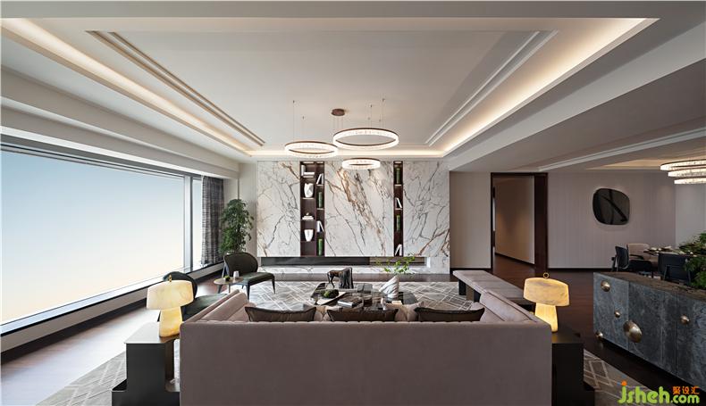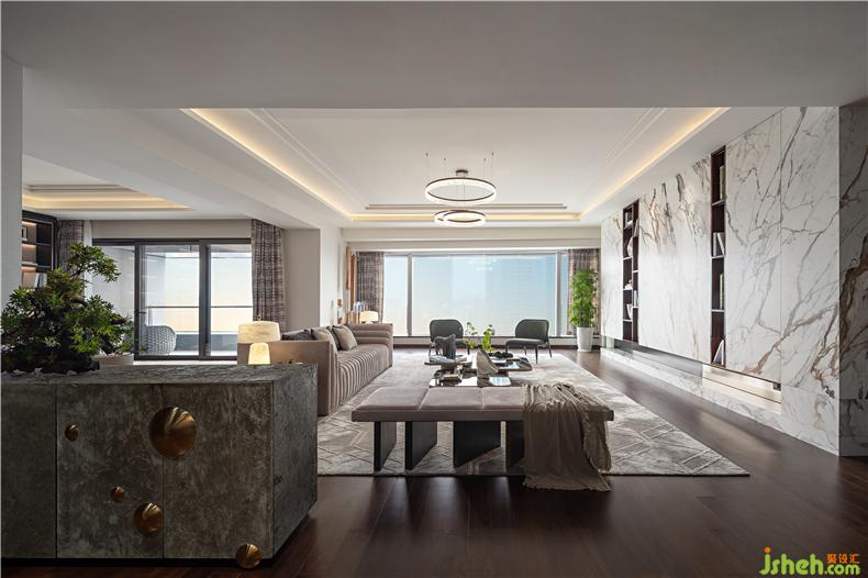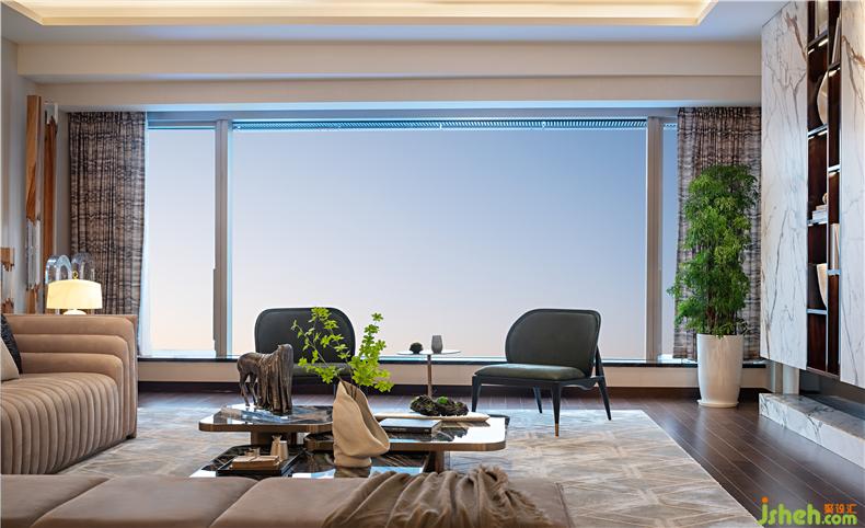 光線,是東方美學(xué)空間的重要元素。約383㎡ 的大平層公寓,立于長約13m超寬尺度的窗前,自然光充盈整個身心,Imax視野令人豁然開朗,過往、當(dāng)下和未來在這里匯聚,靜覽繁華萬象,乘物以游心。樣板房設(shè)計